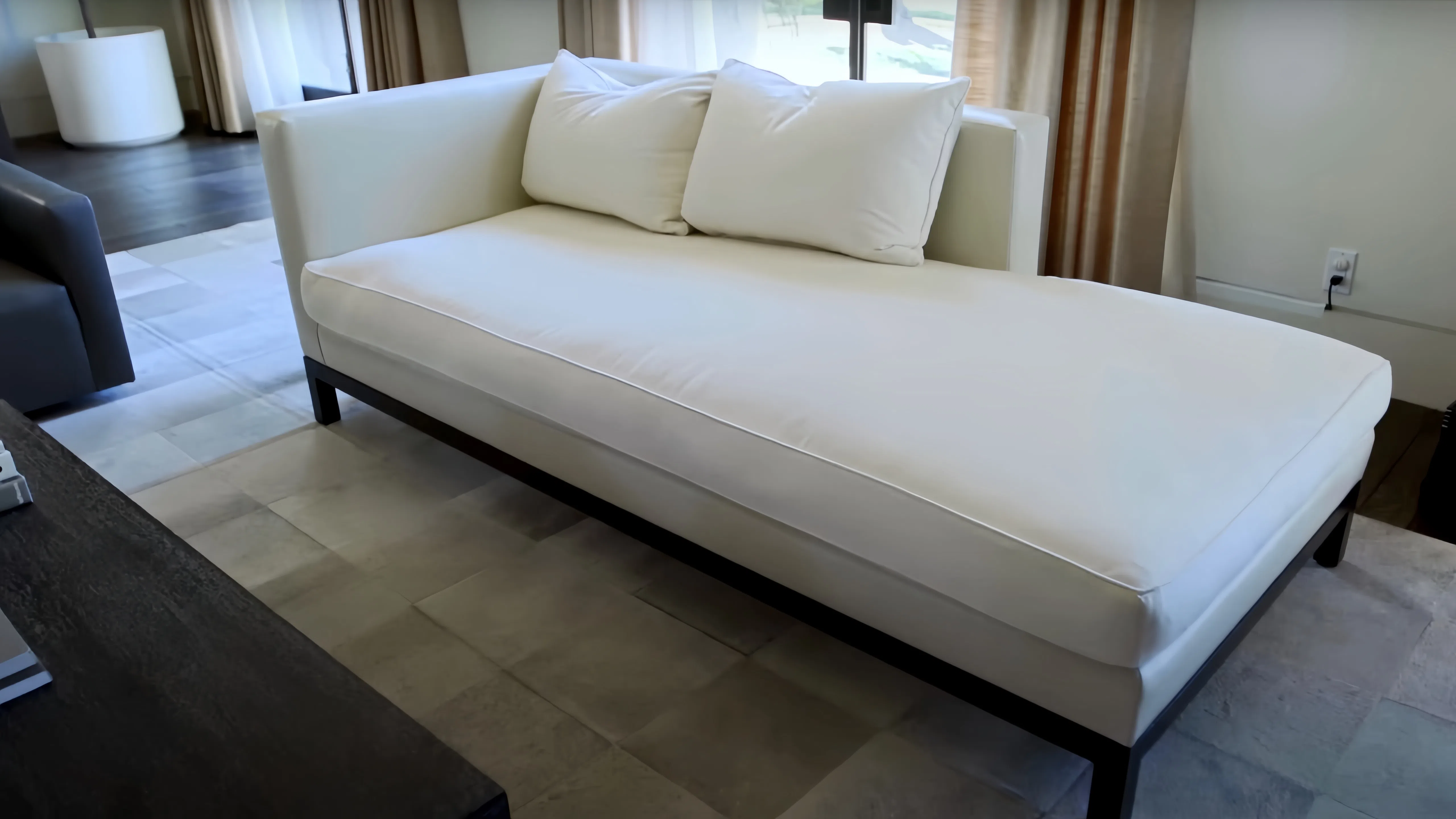Очень лаконичная кушетка, однако, достаточно необычной конструкции. В Китае такие дизайны тоже любят. Поэтому подобрать подобную модель не составит труда. При этом можно найти даже реплики известных брендов всего за $1,300: