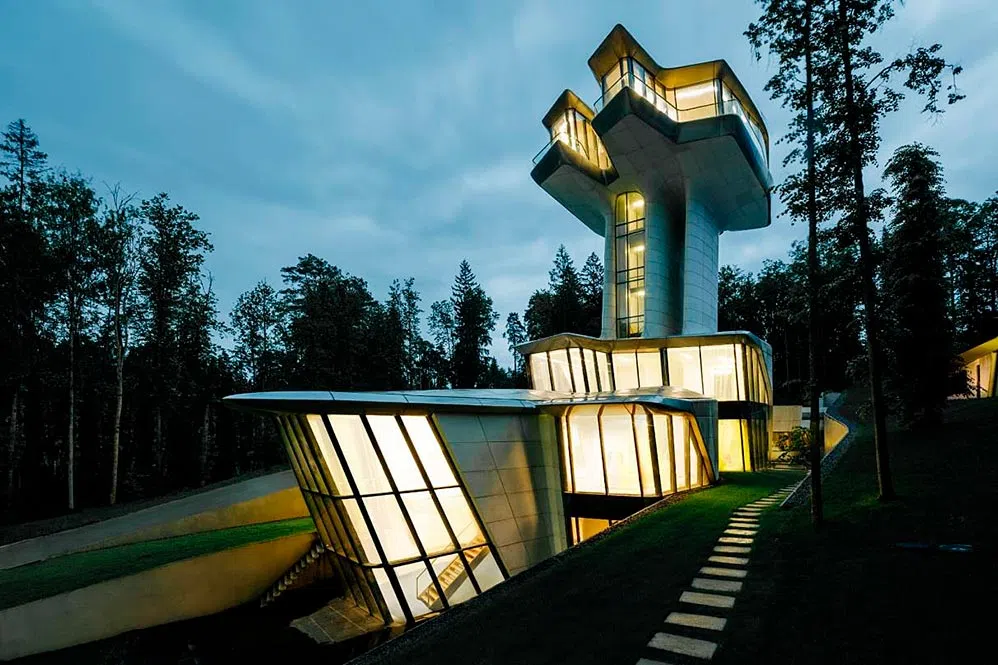“Я хочу просыпаться по утрам, видеть голубое небо и чувствовать себя свободным”, - сказал однажды Владислав Доронин легендарному архитектору Захе Хадид. В итоге она приняла предложение и спроектировала для него многоярусную авангардную виллу, возвышающуюся над макушками густого леса. При всей своей органике ее величественный и таинственный силуэт навевает мысли о космическом шаттле - любимый прием Захи Хадид сочетания футуризма и природных мотивов.
