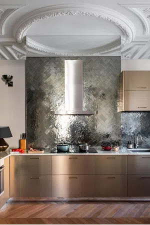 Как правило, при обустройстве пространства везде используются одни и те же металлические элементы: светильники, ручки, петли и т.д. Но 2025 год привнесет в дизайн интерьера новую тенденцию — эксперименты с различными металлическими отделками. Этот подход акцентирует внимание на комбинациях текстур, цветов и блеска, привнося в пространство динамичность и делая его более интересным.
