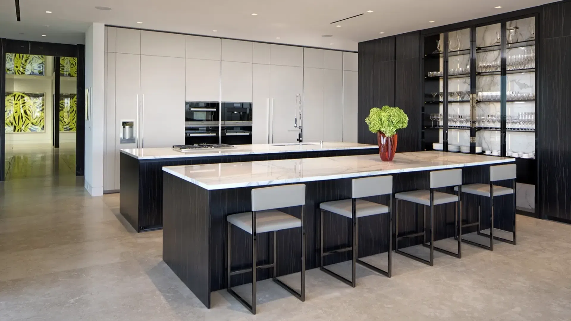 Умная система хранения и планировка кухни позволяют так смело соединить ее с другими пространствами, не боясь за эстетическую составляющую. Мраморные поверхности острова, дополненные основанием из темного дерева, смотрятся очень эффектно. А открытые полки достались лишь сервизам и бокалам, которые являются такими же полноправными элементами декора.