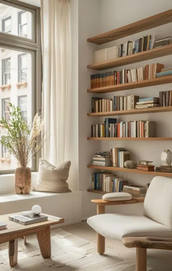 Одним из современных трендов является создание зоны для отдыха в стиле ваби-саби прямо на полу. Стильные пуфы, мягкий ковер, уютные декоративные подушки и атмосферное освещение — все это способствует формированию комфортного уголка для чтения и расслабления.