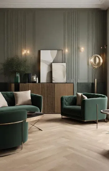 Роскошные материалы. В интерьерах ар-деко для мебели характерно использование дорогих пород древесины, которые создают атмосферу роскоши и уюта. Часто такие изделия обтягиваются бархатом или велюром, добавляя визуальную мягкость и тактильное наслаждение. Кроме того, в оформление пространства активно включают стеклянные, зеркальные и металлические элементы, которые придают интерьеру изысканный блеск и шик.