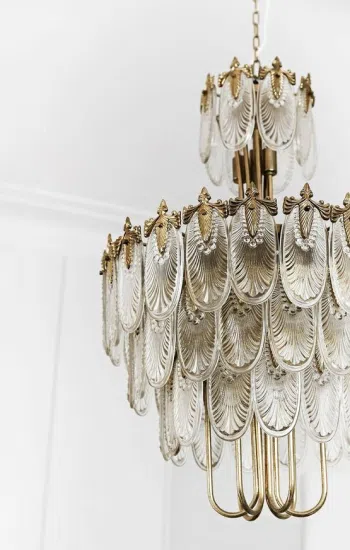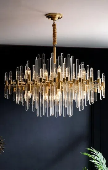Освещение играет одну из ключевых ролей в интерьере ар-деко. В таких пространствах обычно устанавливаются большие акцентные люстры, например, из хрустальных элементов. Но использовать настоящий хрусталь необязательно, так как красиво выглядит и его имитация. Также подходящим вариантом могут стать люстры и светильники с хромированными или золотыми элементами.