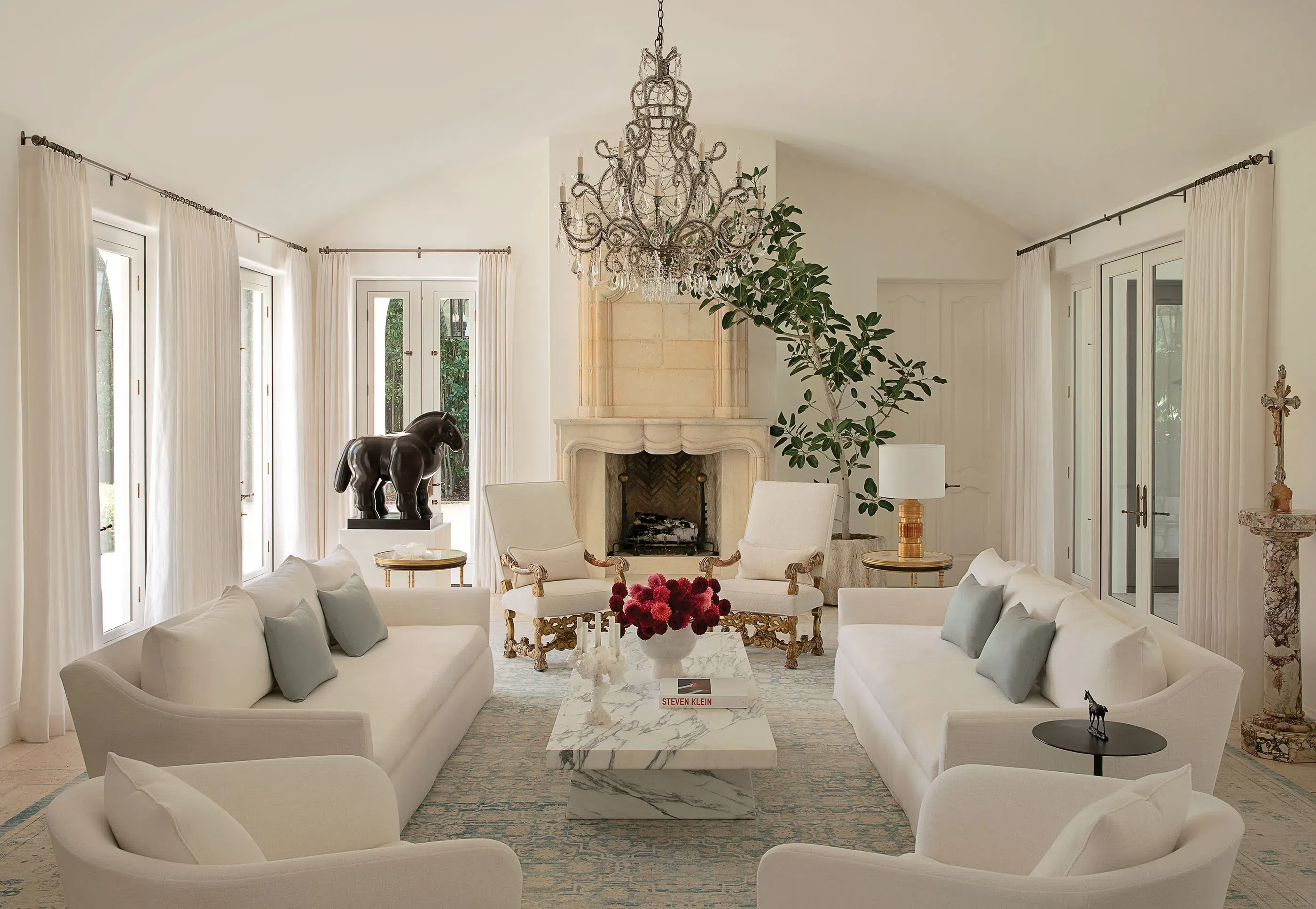 Несмотря на колонны, арки и высокие потолки, София хотела, чтобы дом был уютным и приземленным, обладал дружелюбной атмосферой. И этого успешно удалось добиться дизайнеру проекта Охаре Дэвис-Гаэтано. Гостиная дома Софии Вергары представляет собой идеальный баланс между роскошью и уютом. Это просторное и светлое помещение с мягкими диванами, обитыми тканями нейтральных оттенков. В центре комнаты расположен стильный кофейный столик, пара резных позолоченных кресел в стиле барокко и французский камин из известняка XVIII века. Также индивидуальности пространству придает итальянская люстра XIX века и светлый персидский ковер из Тебриза.