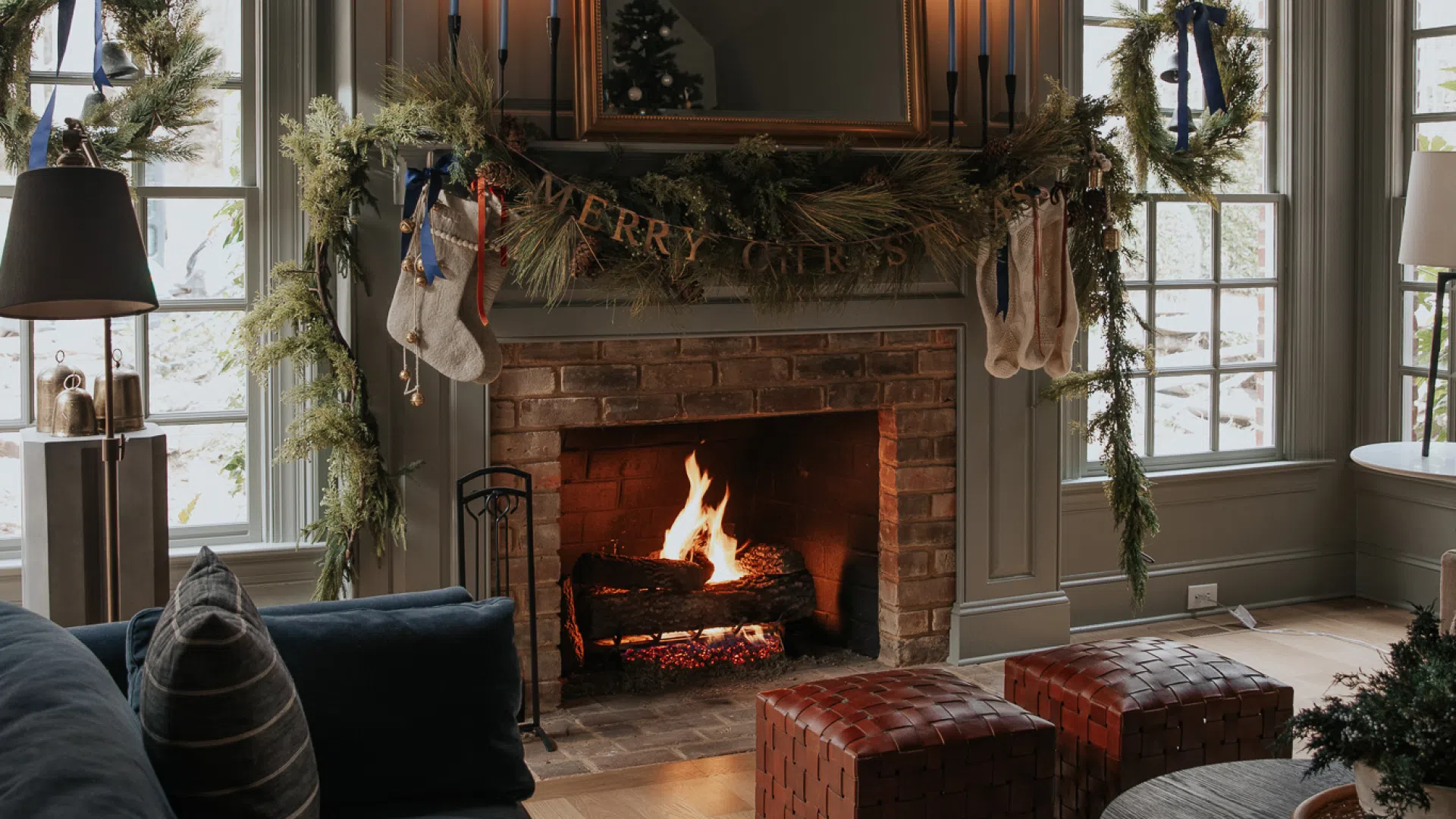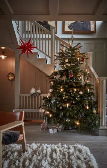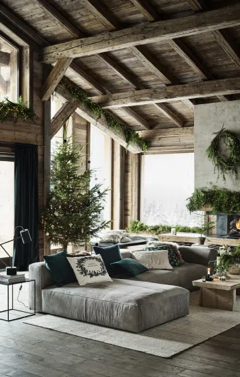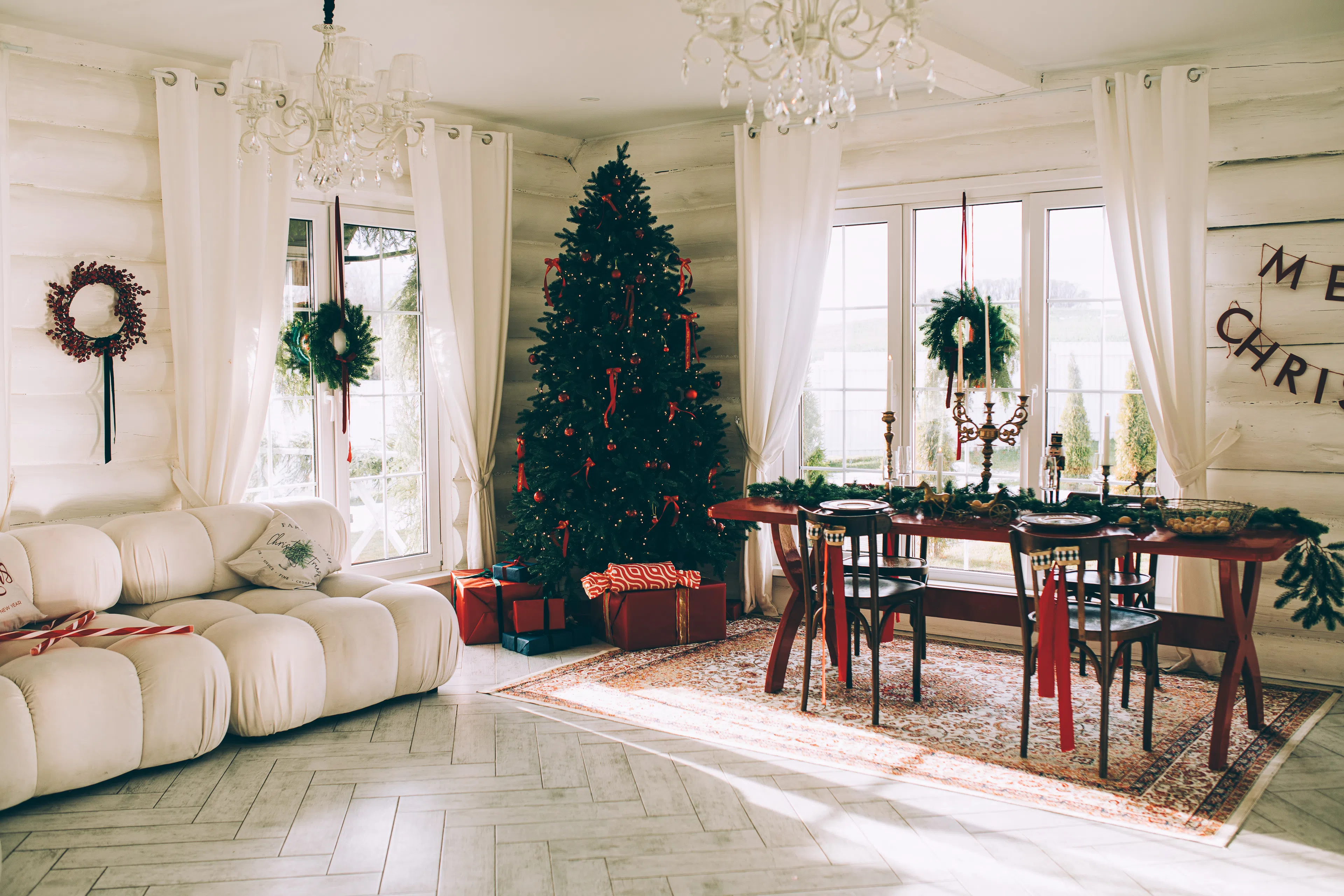 Например, новогодний интерьер в стиле английской классики — это спокойные благородные оттенки (песочный, бежевый, темно-зеленый, бордовый, коричневый), диван Честерфилд и уютная зона отдыха у камина. Добавьте несколько носочков для подарков, ярко-красные цветы пуансеттии и красиво украшенную елку — и уютный новогодний интерьер готов!