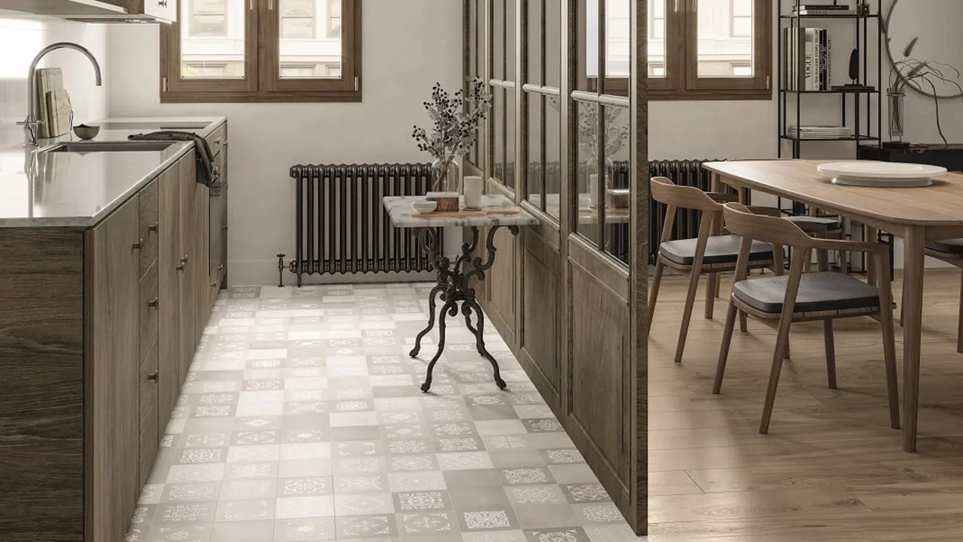 Керамогранитная плитка доступна в большом разнообразии узоров и текстур. Например, есть варианты с имитацией натурального камня, дерева, а также с яркими геометрическими или флористическими рисунками. В дополнение к визуальным преимуществам этот материал не впитывает воду и легко очищается, что делает его отличным вариантом для напольного покрытия кухни.