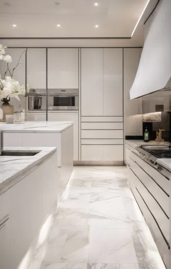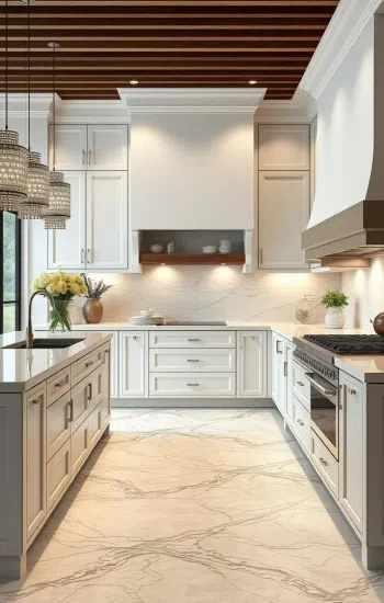 Мраморное напольное покрытие также может стать подходящим вариантом для кухни, если вы стремитесь привнести в пространство элегантность и роскошь. Несмотря на необходимость тщательного ухода, этот материал выглядит очень эффектно.