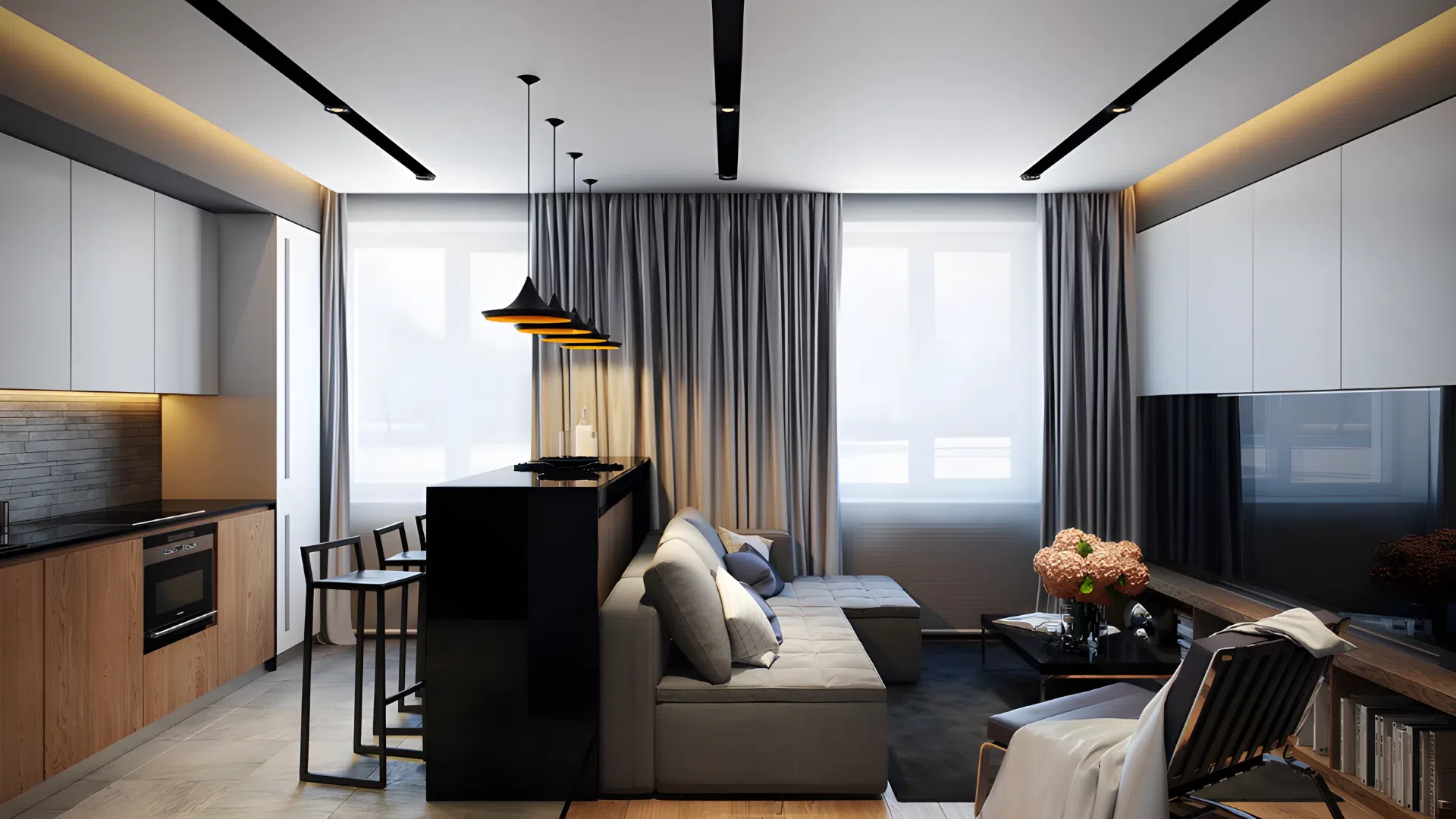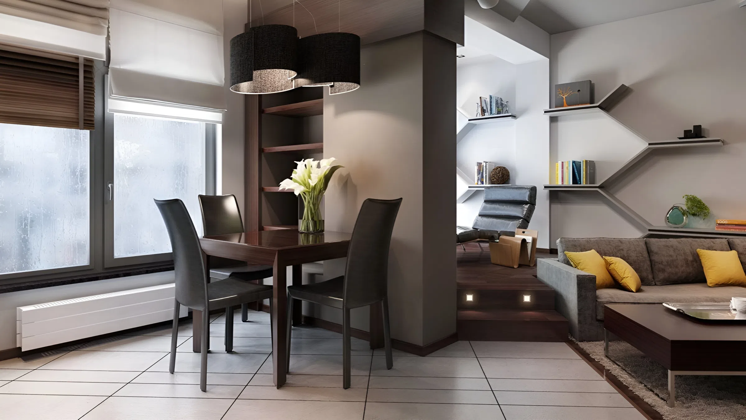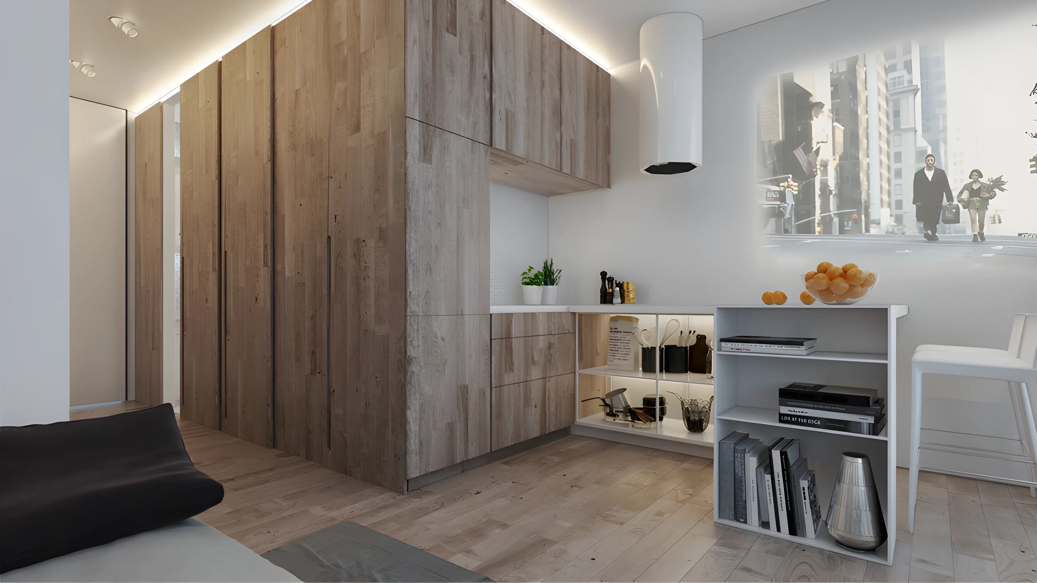 Высокие шкафы, полки до потолка, подвесные светильники - используйте вертикаль по максимуму. Такие элементы вытягивают помещение вверх, создавая ощущение большей высоты потолков.