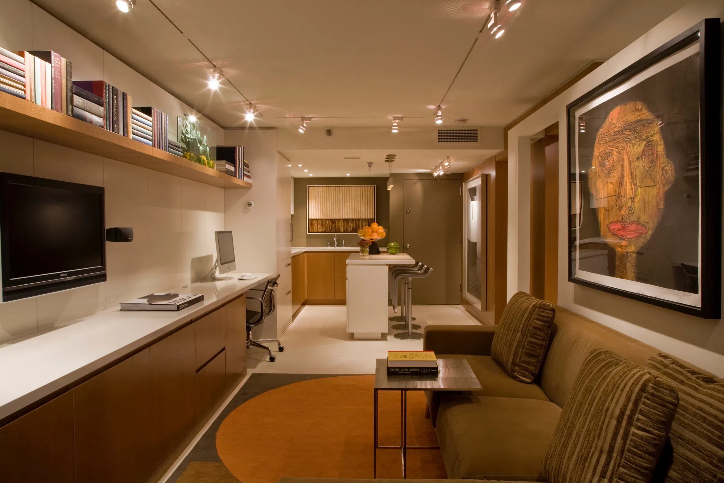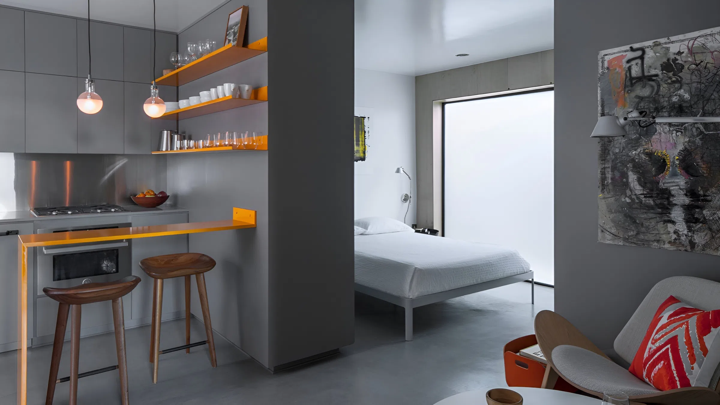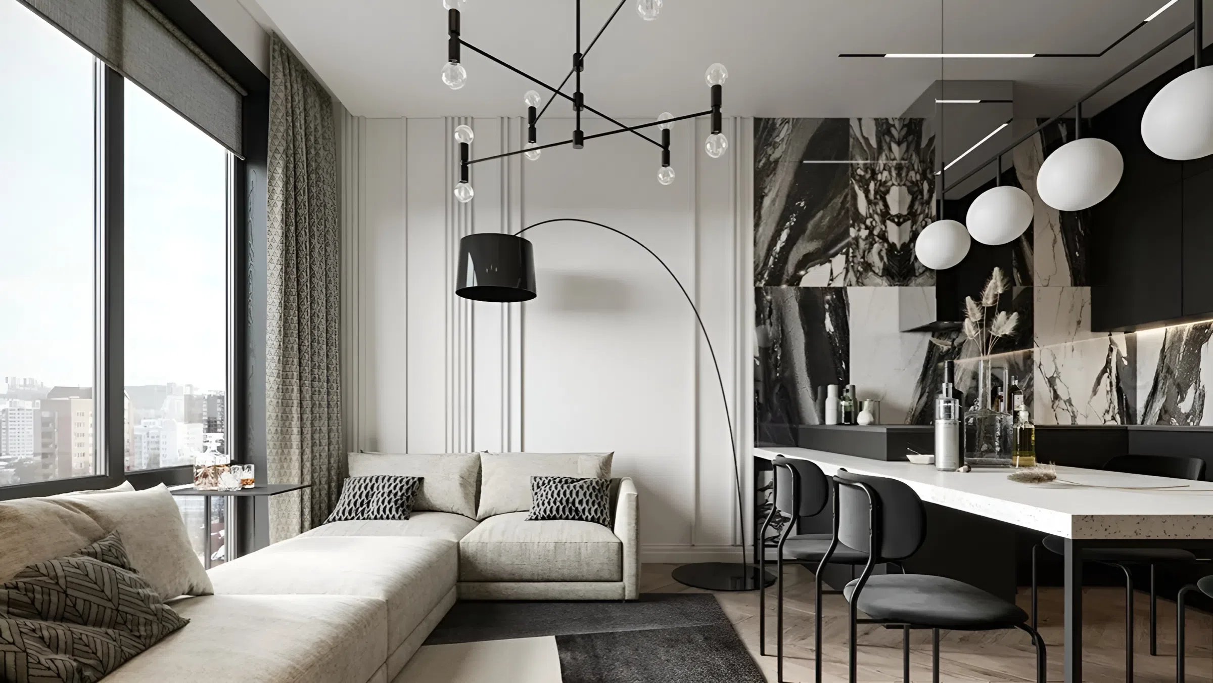 Высокие шкафы, полки до потолка, подвесные светильники - используйте вертикаль по максимуму. Такие элементы вытягивают помещение вверх, создавая ощущение большей высоты потолков.