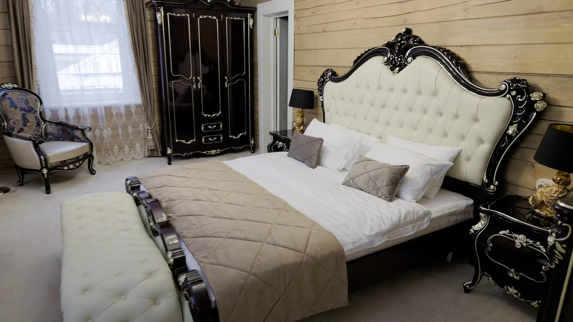 Все номера парк-отеля также выполнены в классическом стиле. Кровати, прикроватные столики, комоды и другие предметы мебели были изготовлены по индивидуальным заказам.