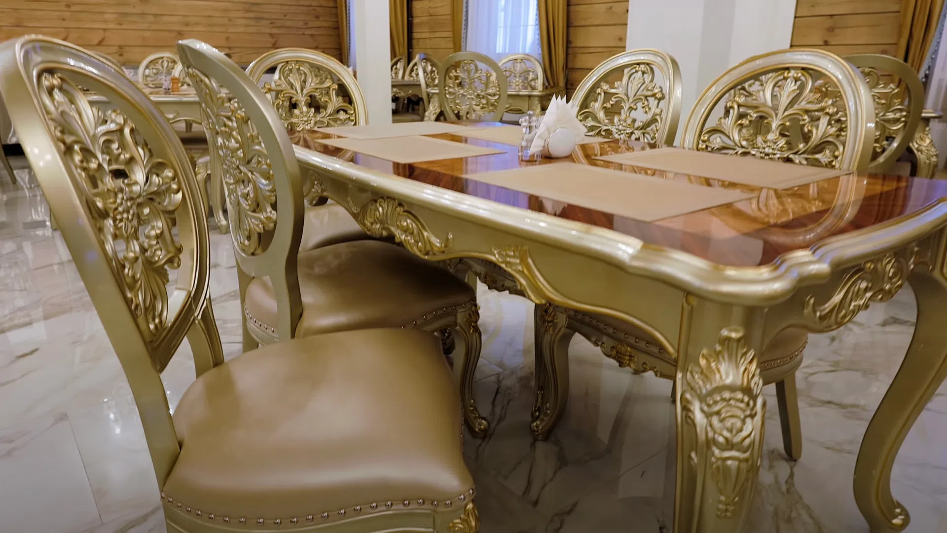 Для ресторана были выбраны роскошные обеденные столы на 4 и 6 персон и стулья с изящными резными спинками. Стоит отметить, что все декоративные резные элементы мебели выполнены вручную.