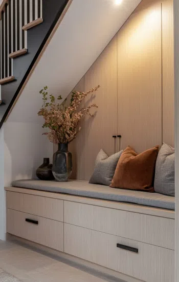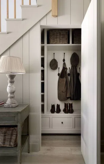 Свободное пространство под лестницей часто упускают из виду, но оно может стать ценной площадью в небольшой прихожей.