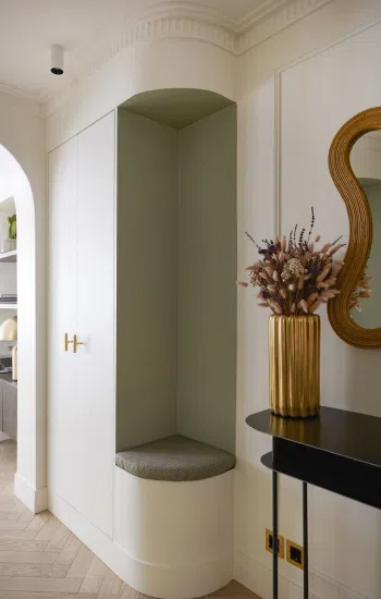 Также хорошим вариантом будет обустройство уютного уголка с мягкой скамейкой или пуфом, где удобно надеть обувь или просто отдохнуть.