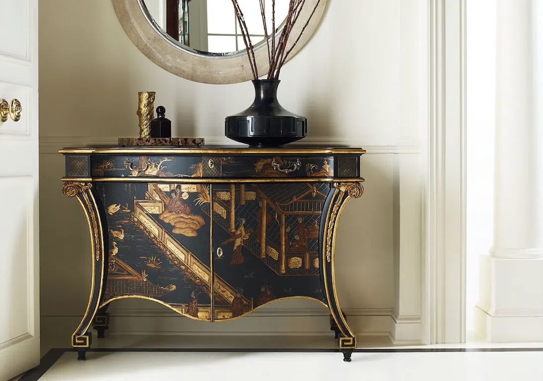 В 17-18 веках по мере развития торговли с Азией возрастал и интерес Старого Света к китайской культуре и традициям. Отдавая дань моде, высшее общество обставляло свои гостиные и будуары на манер à la Chinoise: лакированная мебель с резными ножками, акварельные сюжеты, насыщенные яркие оттенки, тонкий фарфор… Только вот европейские мастера не просто копировали все китайские каноны, а скорее адаптировали их под местные вкусы. В результате этого появился такой воздушный и выразительный стиль на стыке французского рококо и китайской классики.