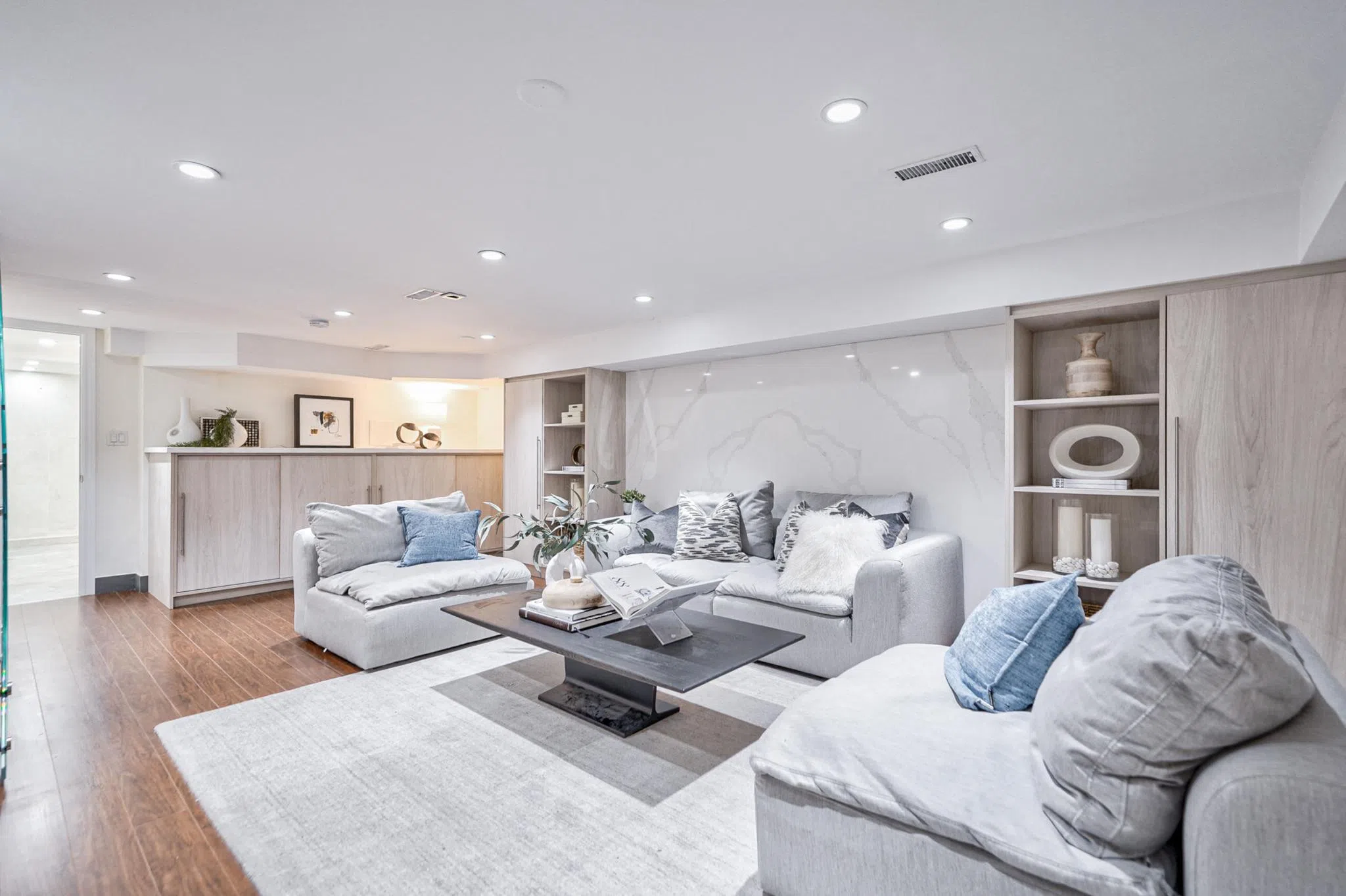 Просторная гостиная оформлена в нейтральных успокаивающих тонах, благодаря чему это место идеально подходит для отдыха после долгого дня. Однако акценты в виде подушек с принтами и искусственных растений привносят в пространство динамику и индивидуальность.
