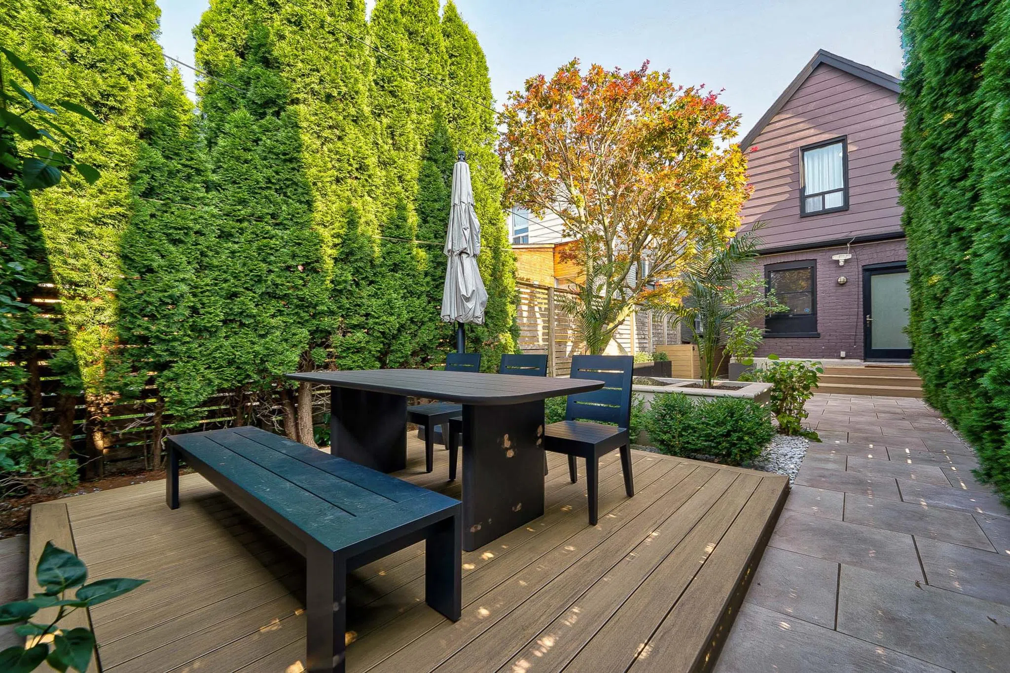 Кухня дома имеет прямой выход на уединенный и тихий задний двор, окруженный пышной зеленью. Стильная уличная мебель, которая отлично сочетается с фасадом дома и общей концепцией интерьеров, позволяет устроить трапезу на открытом воздухе или выпить чашечку бодрящего кофе сразу после пробуждения.