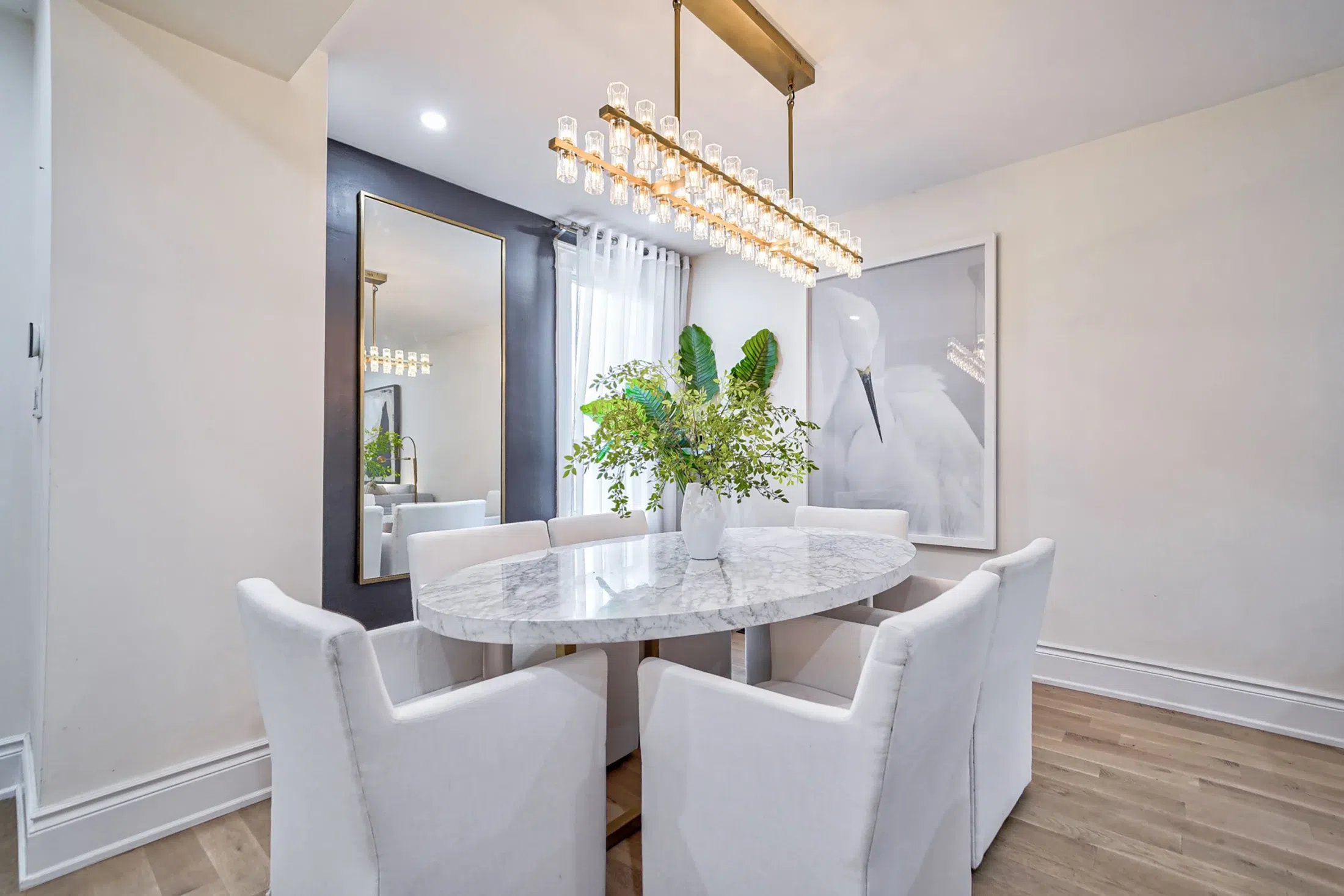 Все пространства в доме, включая и эту обеденную зону, выглядят элегантно и лаконично. Однако большой мраморный стол и акценты в виде дизайнерской люстры и настенных предметов декора добавляют пространству индивидуальности.