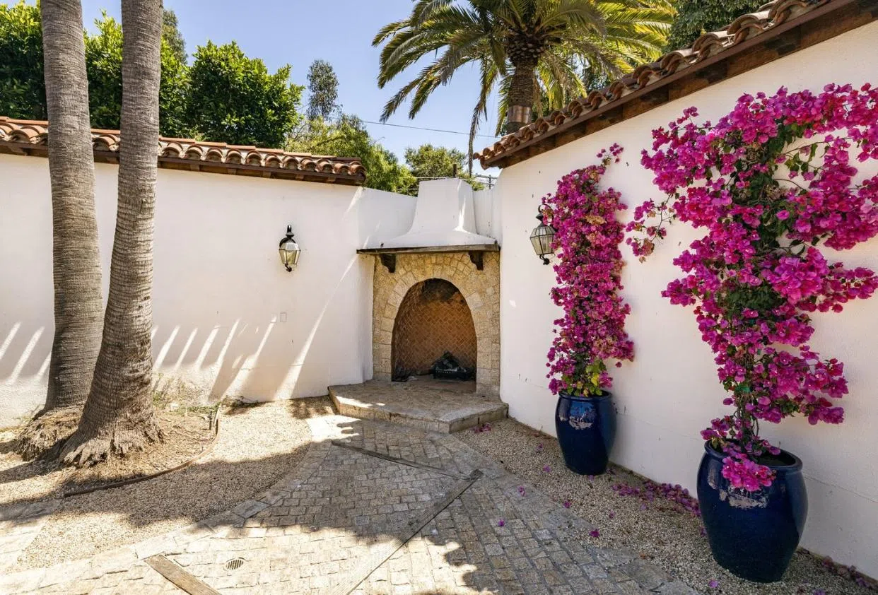 На территории участка есть уютный уголок для отдыха с камином, просторный бассейн и зона для барбекю, также выдержанные в общем стиле интерьеров дома. Это очаровательное открытое пространство обладает теплой и гостеприимной атмосферой, а большое количество растений делает его еще более гармоничным.