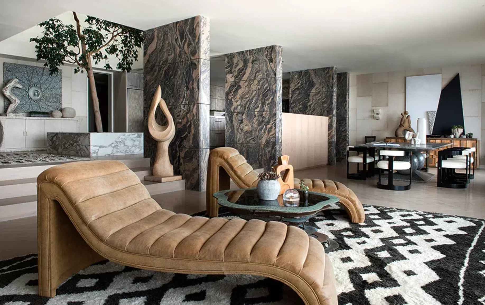 Дизайнеры все чаще комбинируют различные натуральные материалы, такие как дерево, металл, сколотый гранит, кожа и текстиль, чтобы создать многослойные и богатые текстурные композиции. Порой рельеф переходит на вертикальные панели и даже обои. Такие дополнительные объемы и органичность форм возвращают нас к природе и наполняют пространство умиротворением.