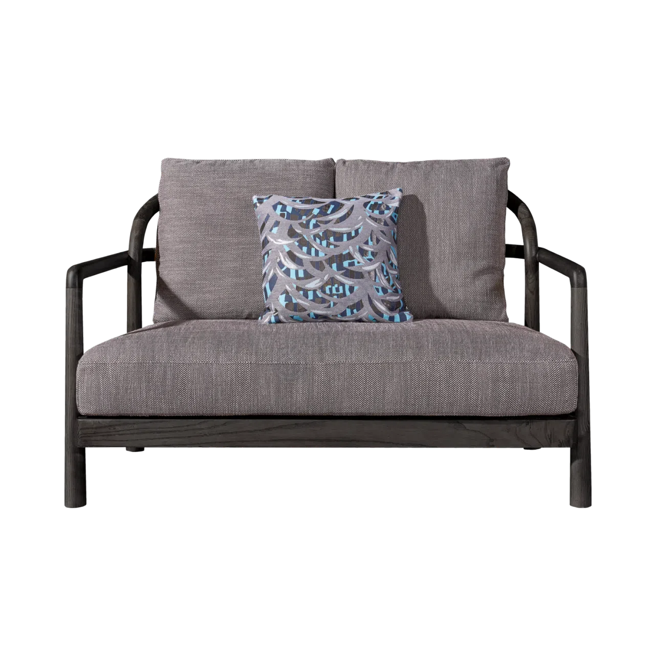 Сиденье и спинка обтянуты высококачественным текстилем глубокого синего цвета, приглашающим к полному расслаблению. Наполнение, включающее пух, придает подушкам особую мягкость и упругость, обеспечивая исключительный комфорт во время отдыха. Дополнительная декоративная подушка с геометрическим узором завершает образ и предлагает дополнительную поддержку.