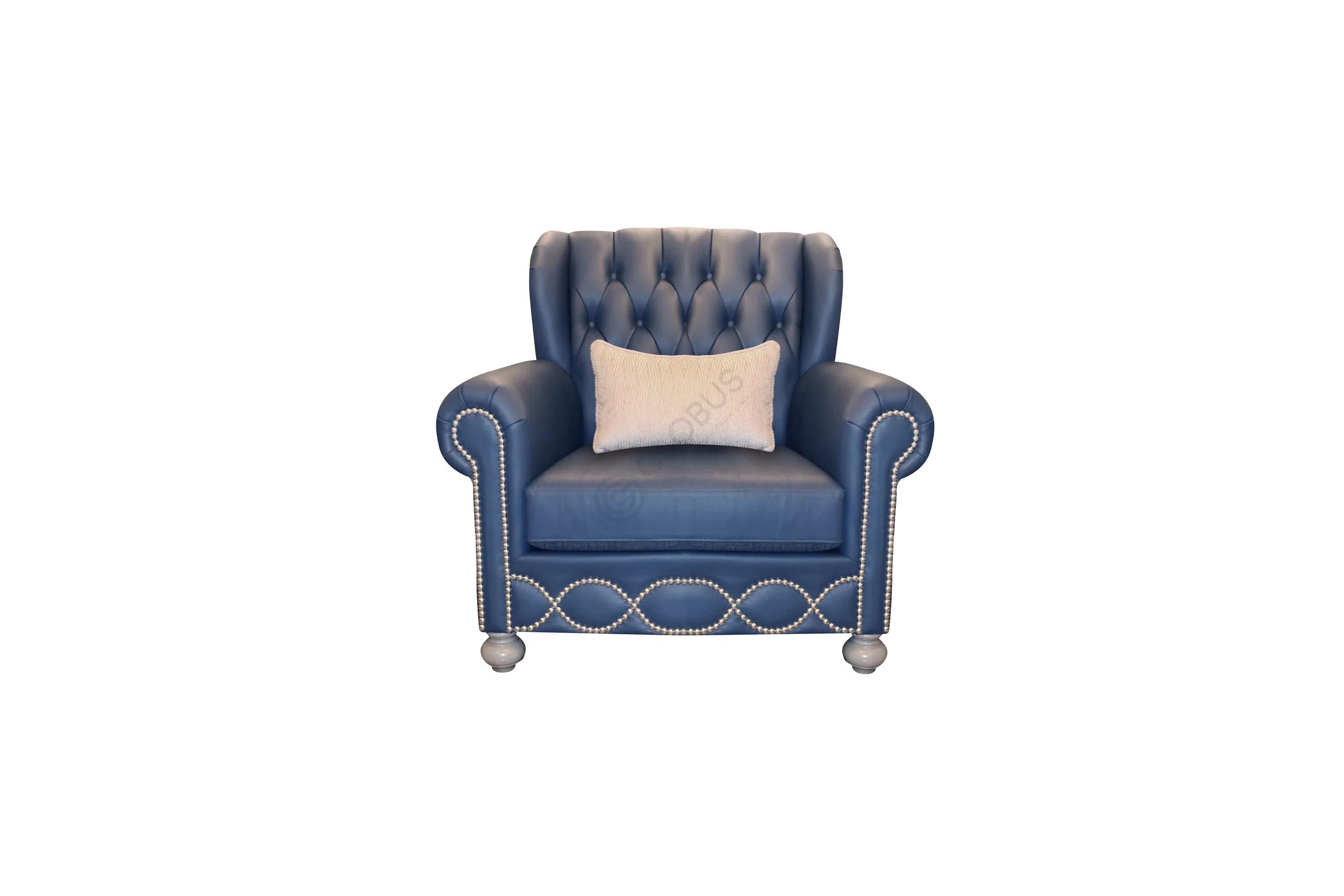 Форма изделия сочетает в себе характерные черты классического дизайна: высокая спинка с мягкими изгибами, напоминающая крылья, и пышные подлокотники с плавными очертаниями. Изысканная каретная стяжка на спинке добавляет фактурности и визуального объема. Особое внимание привлекает декоративная отделка по периметру основания и подлокотников — ряд металлических элементов, выложенных волнообразным узором, подчеркивает утонченность линий.