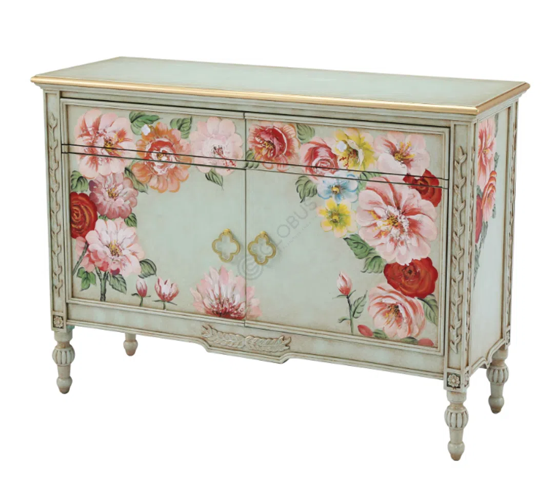 Этот изысканный предмет мебели привлекает взгляд своим насыщенным бирюзовым оттенком и уникальной росписью. Каждая деталь фасада, от изображений оливковых ветвей до центрального мотива с бантом, выполнена с особенным вниманием, придавая изделию неповторимый характер. Искусно нанесенные узоры подчеркивают элегантность форм и создают ощущение ручной работы.