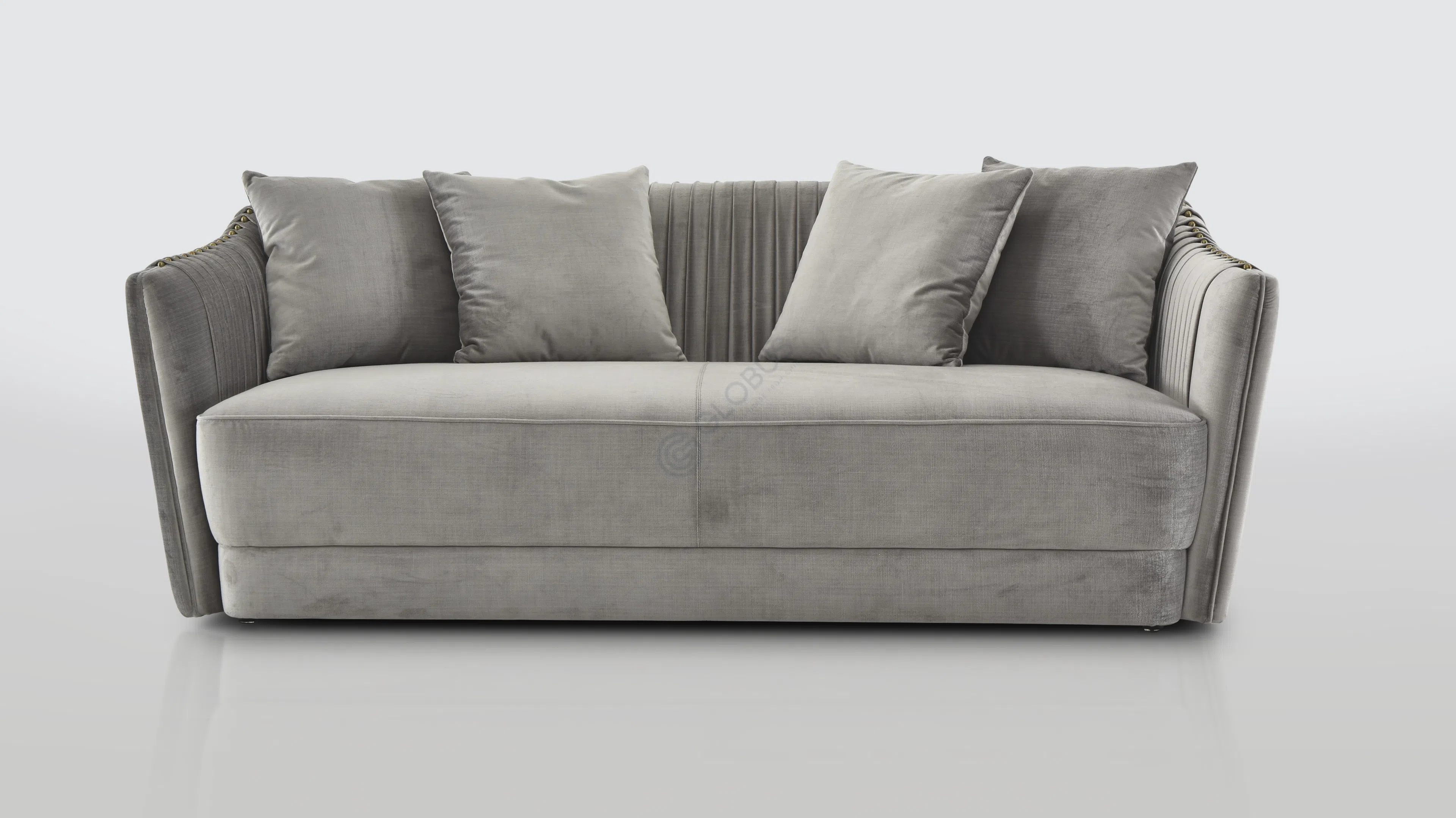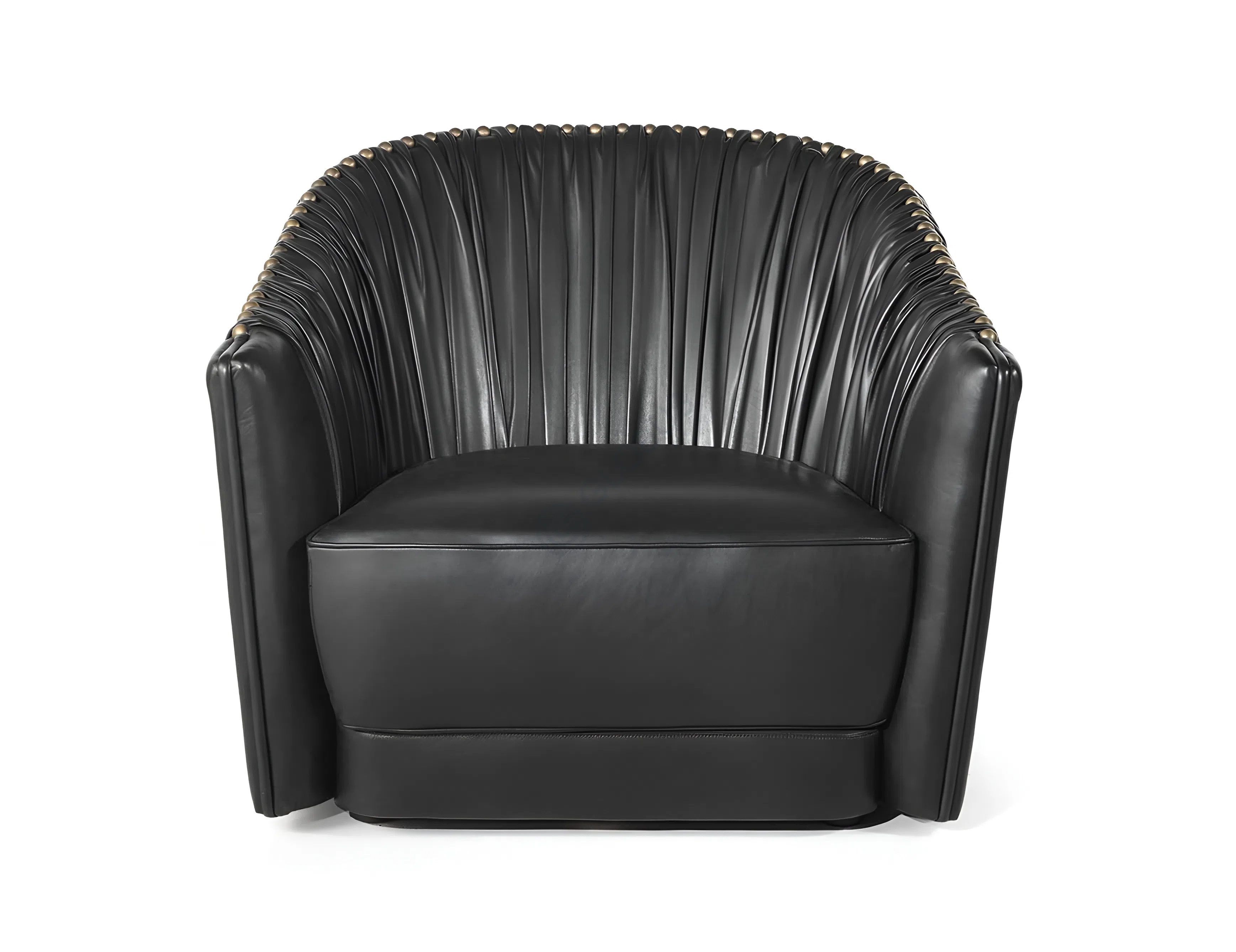 Особое внимание привлекает высокое изголовье с объемной вертикальной плиссировкой, выполненное из премиальной экокожи на микрофибре. Этот материал дарит невероятную мягкость и приятную тактильность, а его глубокий оттенок подчеркивает благородство дизайна. Изящные металлические акценты по бокам изголовья добавляют изделию нотку утонченного шика.