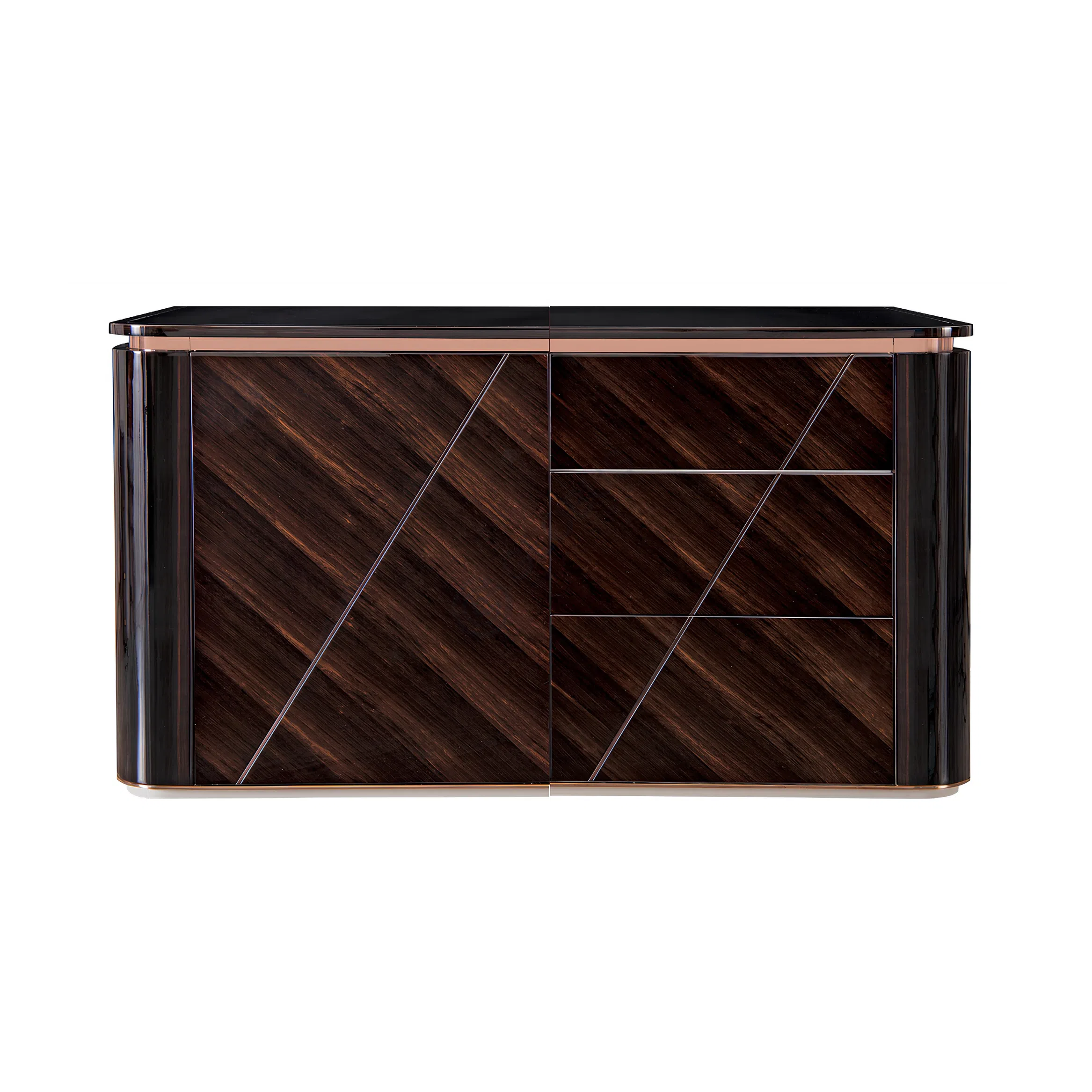 Основой конструкции служит натуральное дерево и фанера, обеспечивающие прочность и долговечность. Уникальность внешнему виду придает отделка из нержавеющей стали, образующая выразительный геометрический рисунок на фасадах и утонченно обрамляющая основание. Этот графический декор придает предмету особую динамику и визуальный интерес.