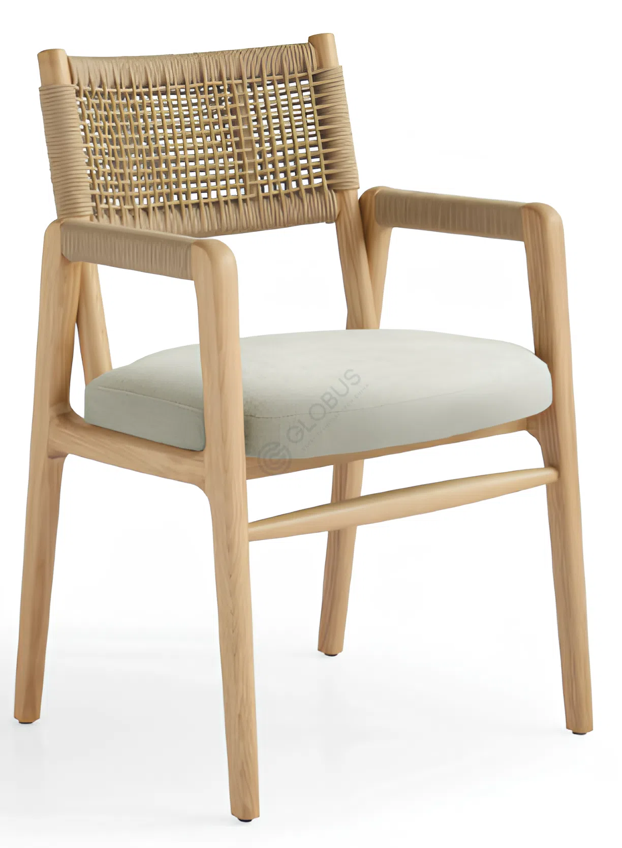 Кресло сочетает в себе натуральные материалы и современный дизайн. Каркас из дерева с гладкой текстурой придаёт конструкции устойчивость и надёжность. Спинка из переплетённой верёвки добавляет лёгкости и оригинальности, создавая визуальную гармонию. Мягкое текстильное сиденье обеспечивает комфорт, а элементы из фанеры подчёркивают лаконичный стиль.