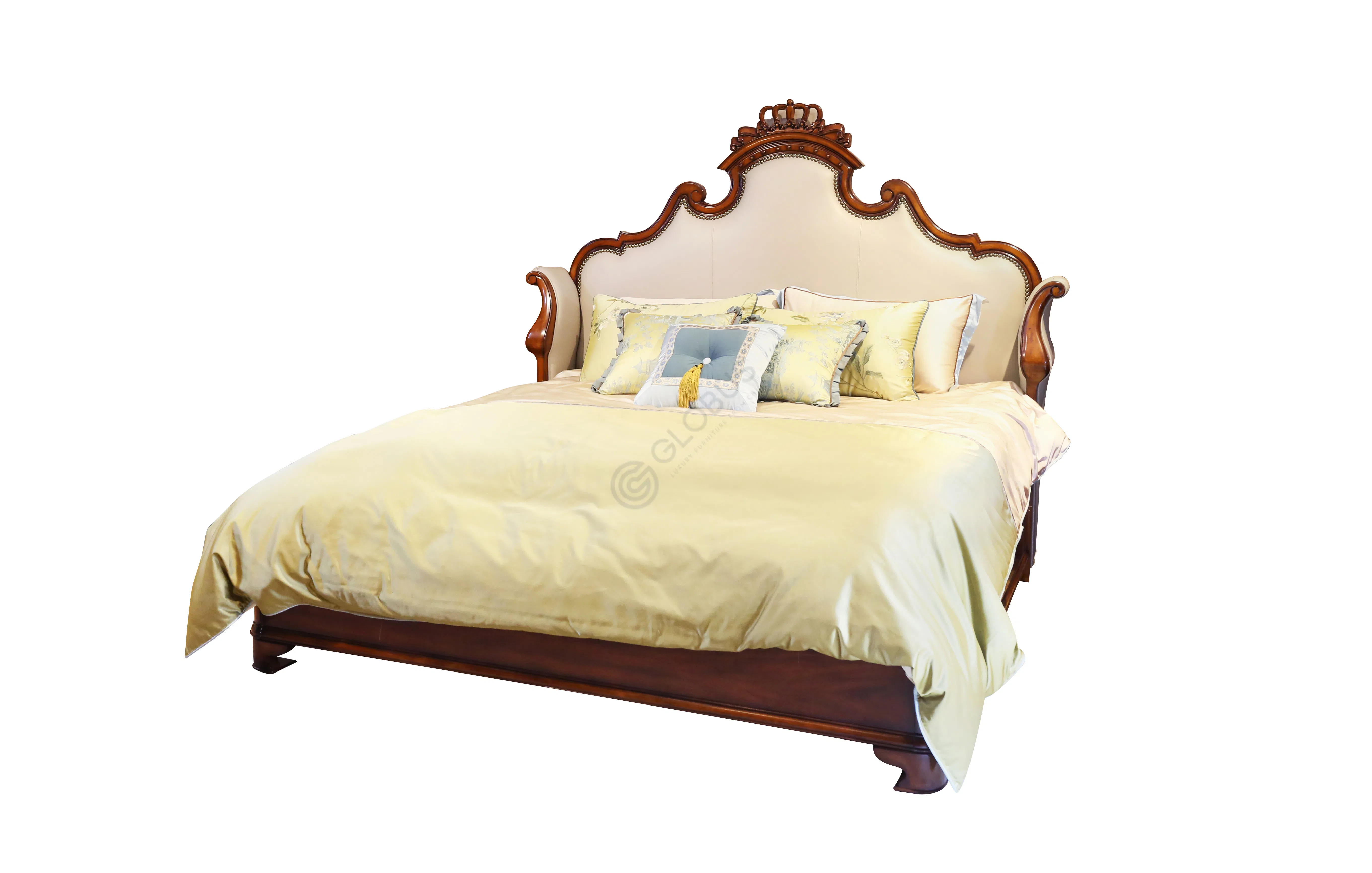 Изголовье кровати является центральным элементом, привлекая взгляд своими плавными изгибами и богатым декором. Мягкая кожаная панель, обрамленная резным натуральным деревом, создает ощущение комфорта и презентабельности. Изящная корона, венчающая верхнюю часть, подчеркивает благородство и высокий статус предмета.