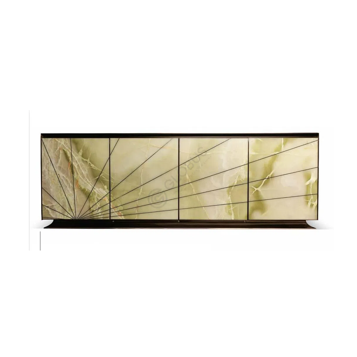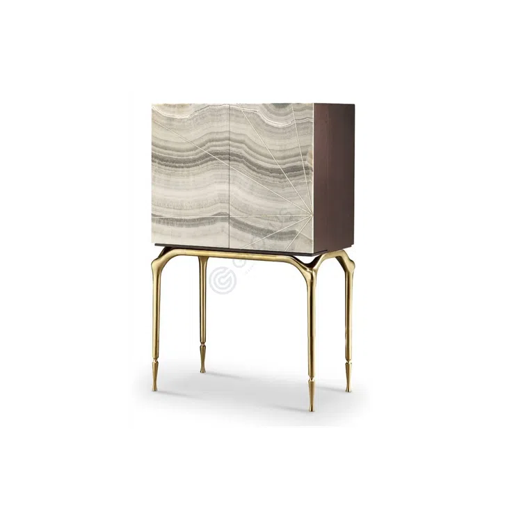 Консоль создает впечатление предмета искусства благодаря гармоничному сочетанию агата и натурального дерева. Природный рисунок камня на фасадах красиво раскрывается в минималистичной раме, а сияние латуни придает изделию ощущение утонченности.