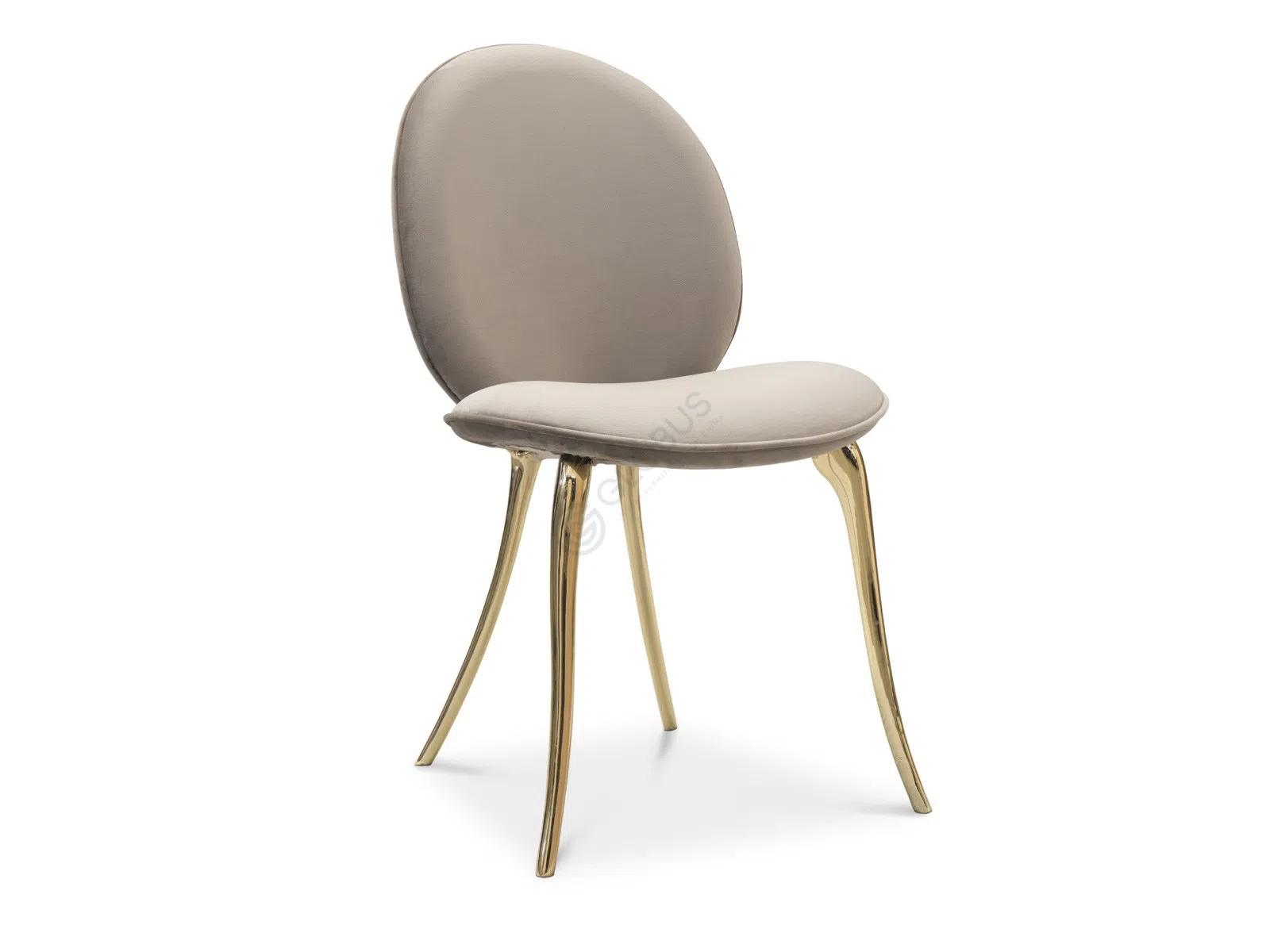 Каркас выполнен из натурального дерева, обеспечивающего надежность и стабильную геометрию. Бархатистый на ощупь текстиль выглядит благородно и держит форму, а латунные детали подчеркивают характер: каплевидные накладки на торцах подлокотников и рельефный цоколь с теплым металлическим блеском добавляют глубины и света.