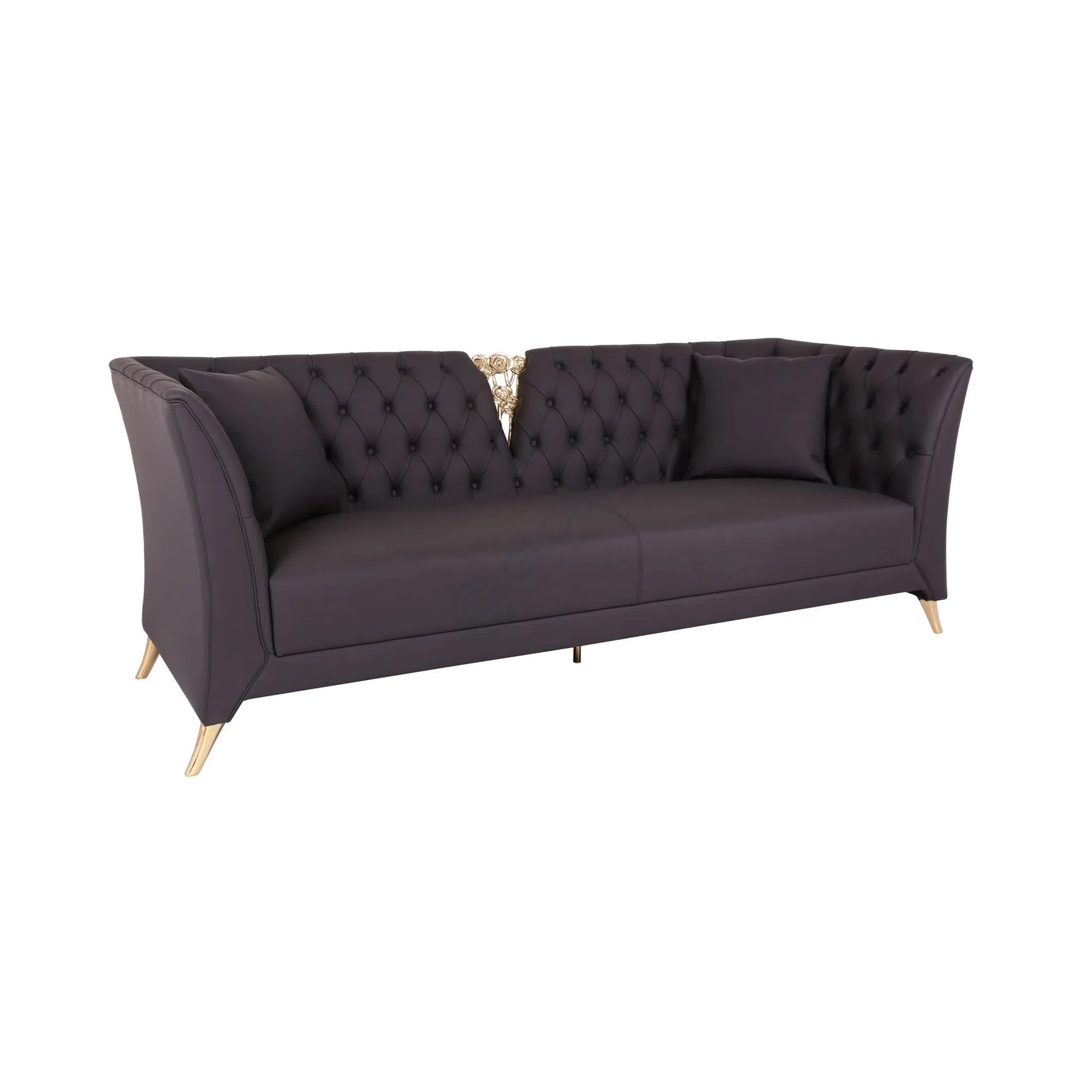 Визитной карточкой является высокое фигурное изголовье. Оно обито мягким текстилем и украшено глубокой стежкой капитоне, создающей объем и фактуру. Особое внимание привлекает декоративная латунная вставка в верхней части, выполненная в виде стилизованного растительного орнамента, которая придает изделию уникальность и завершенный вид. Боковые части изголовья изящно изогнуты, добавляя силуэту динамики и величественности.