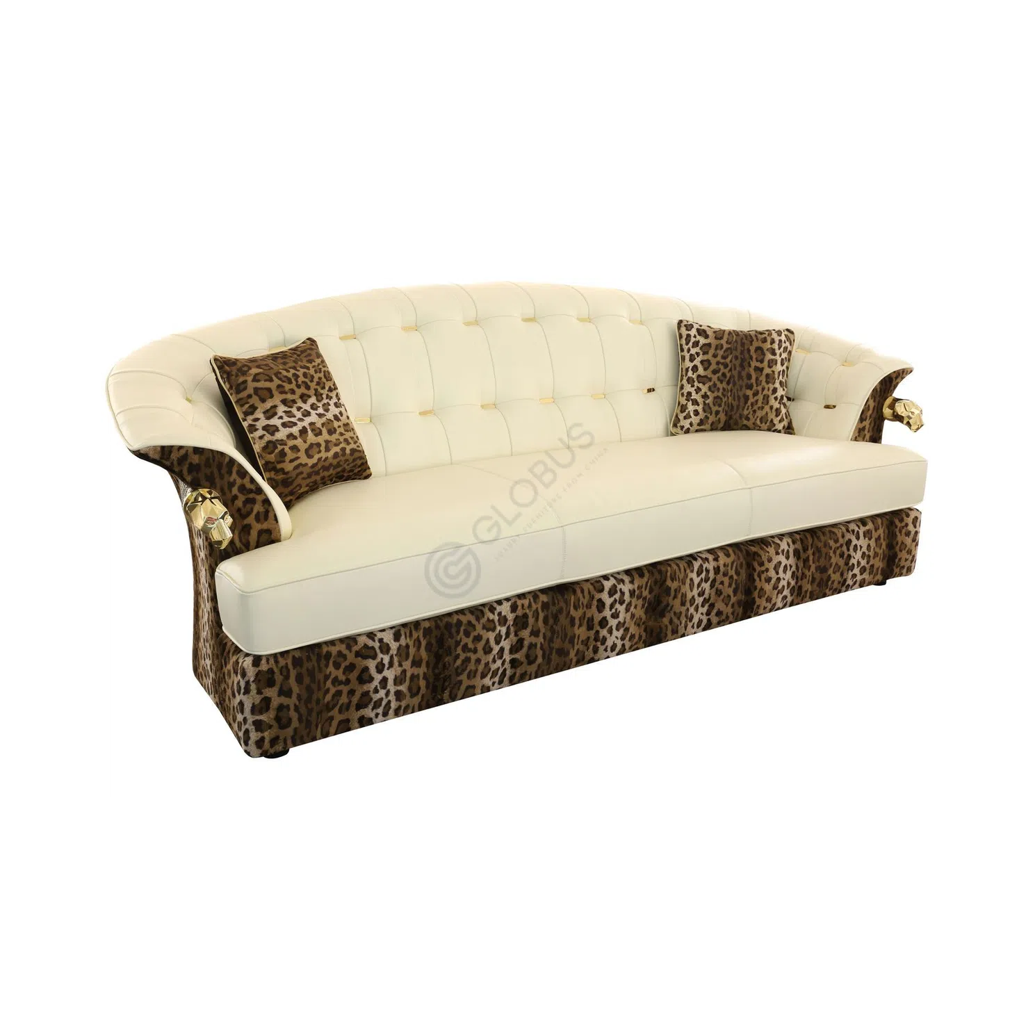 Сиденье и внутренняя часть спинки обтянуты светлым материалом – нежной кожей или благородным текстилем, украшенным классической стежкой с пуговицами, которая придает ему объем и утонченность. Особую выразительность креслу придает контрастный текстиль с ярким анималистическим узором, покрывающий основание и внешние стороны подлокотников. Декоративные элементы из полированной латуни на боковинах завершают образ, добавляя нотку гламура и подчеркивая внимание к деталям.