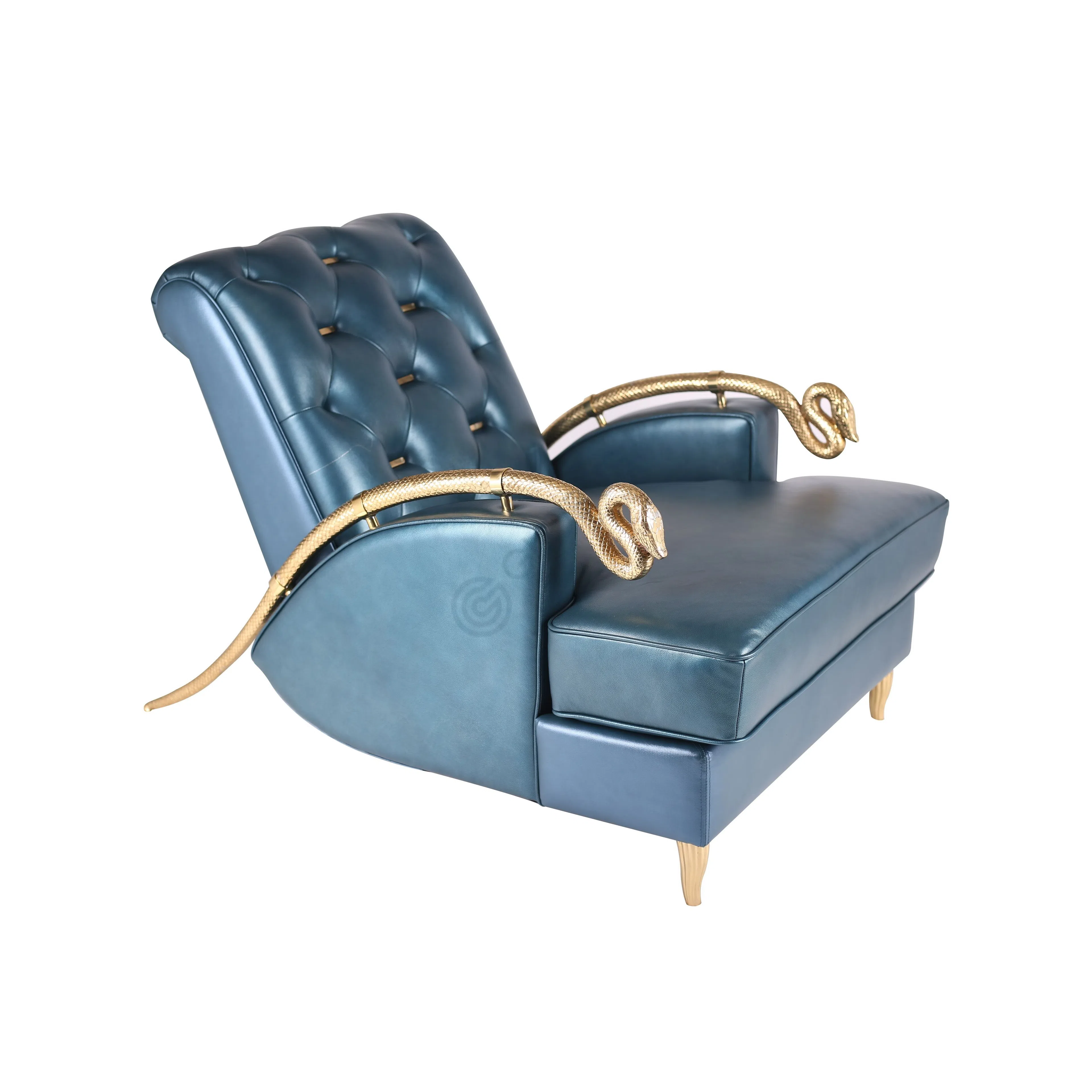 Особое внимание уделено деталям, подчеркивающим его уникальность и роскошь. Поверхность обтянута качественной экокожей, обладающей приятной текстурой и долговечностью. Декоративные элементы из полированной латуни, расположенные на подлокотниках, выполнены в оригинальной форме, добавляя изделию художественную ценность и неповторимый шарм.