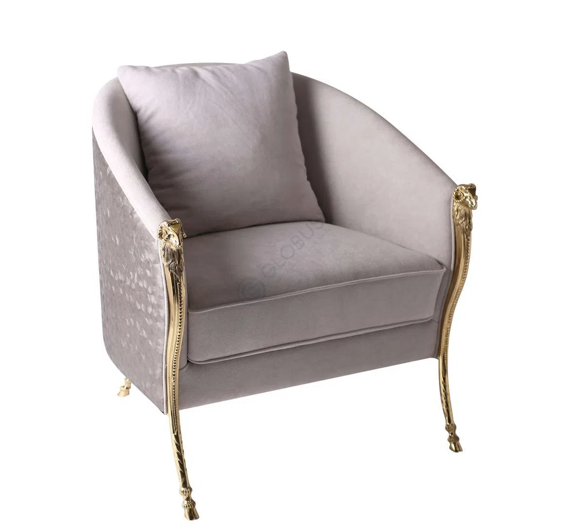 Каркас предмета выполнен из натурального дерева, обеспечивая прочность и долговечность конструкции. Детали из латуни, украшающие ножки и элементы подлокотников, добавляют благородный блеск и подчеркивают принадлежность к сегменту премиум-мебели. Один из подлокотников привлекает внимание необычной текстурой, выполненной, вероятно, с использованием экокожи или специального текстиля, создавая интригующий визуальный акцент.