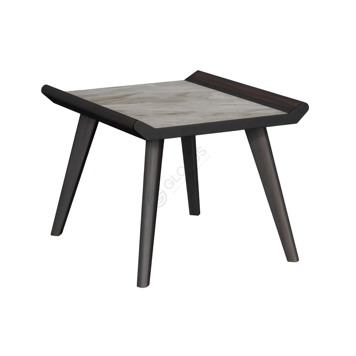Его столешница выполнена из натурального мрамора, чья уникальная текстура рассказывает свою историю в каждом узоре и прожилке. Завершающие элементы по краям, обтянутые экокожей на микрофибре, добавляют тактильной мягкости и утонченного контраста к холодному великолепию камня.