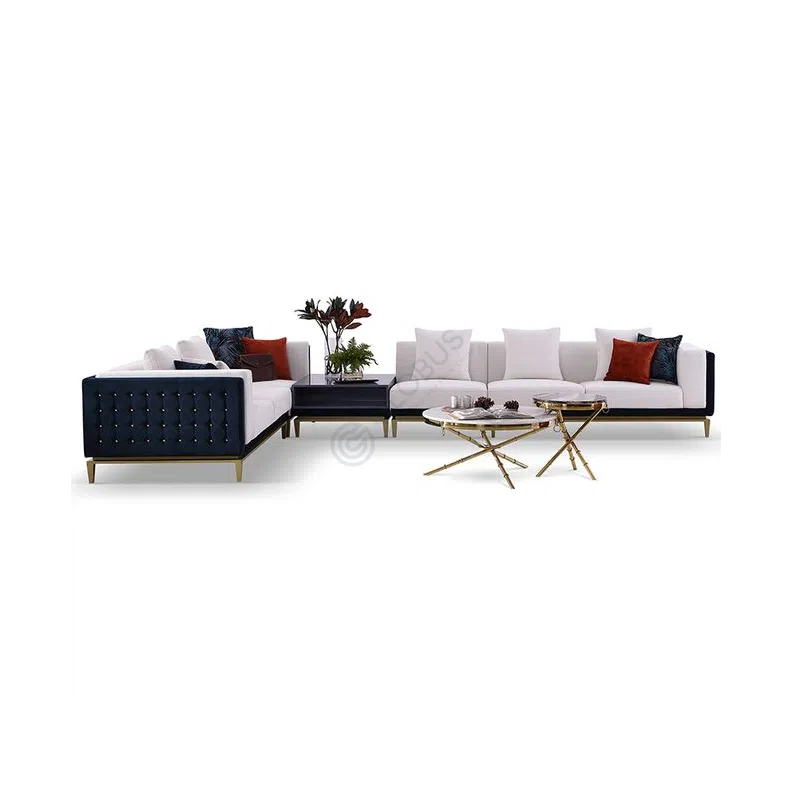 Изящные металлические ножки и декоративная отделка создают выразительный контраст, подчеркивая общую эстетику предмета. Подлокотник, украшенный пиковкой, добавляет нотку мастерства и особого шарма. Этот предмет мебели обеспечивает достаточно места для сидения, включая секцию шезлонга для полноценного расслабления, воплощая функциональность и современную роскошь.