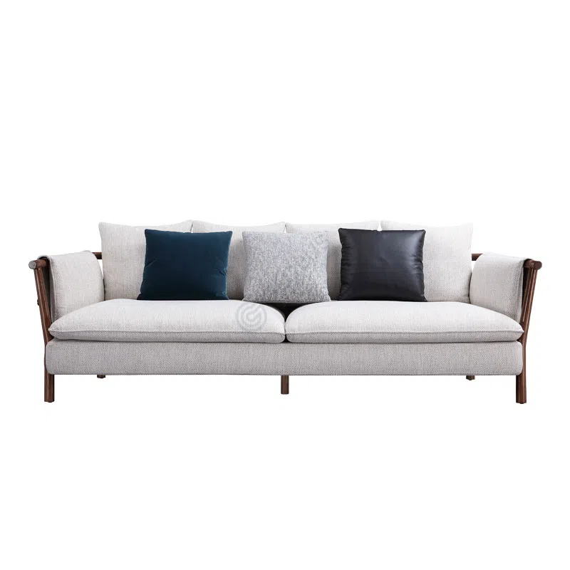 Каркас выполнен из натурального дерева, демонстрируя мастерство исполнения и прочность конструкции. Глубокий оттенок древесины придает изделию солидность и утонченность. Основание обеспечивает надежность и долговечность, становясь крепкой опорой для мягкой части.