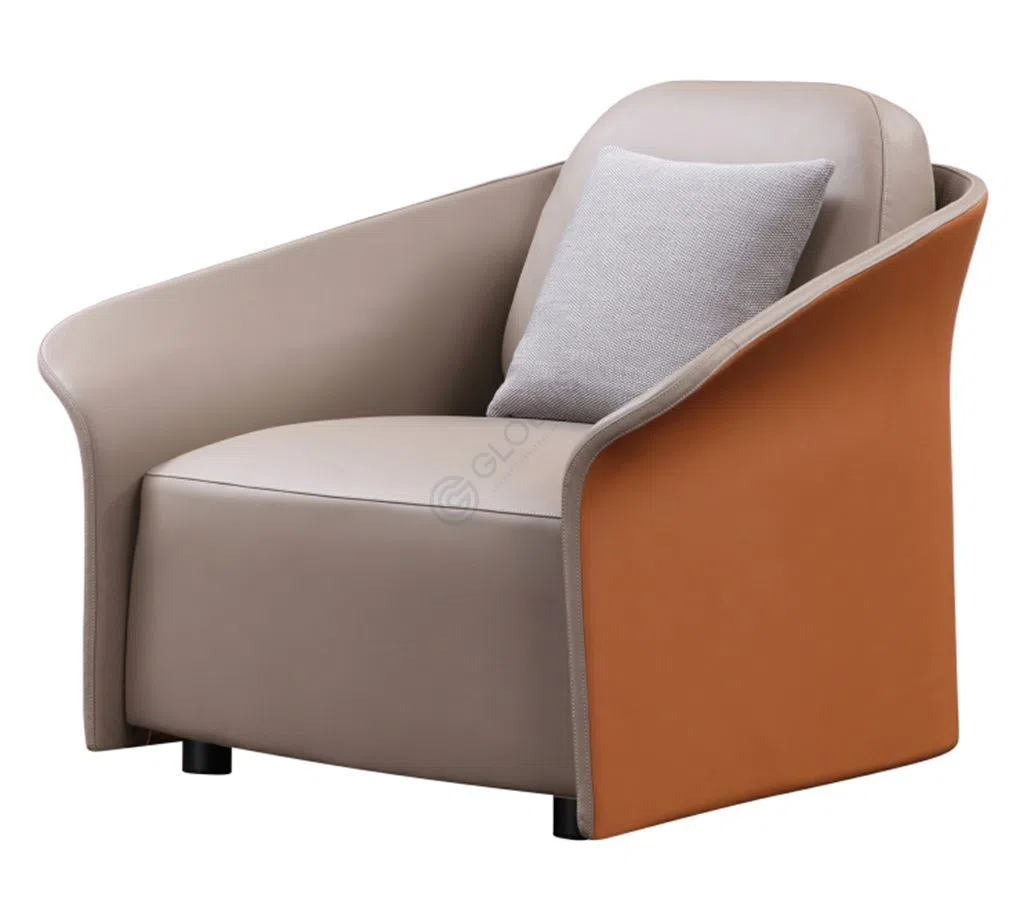 Особое внимание привлекает изысканное сочетание материалов. Обивка выполнена из высококачественного текстиля приятного нейтрального оттенка, который гармонично дополняется элементами из натуральной кожи на подлокотниках. Этот контраст текстур и цветов придает изделию особую выразительность и ощущение роскоши.