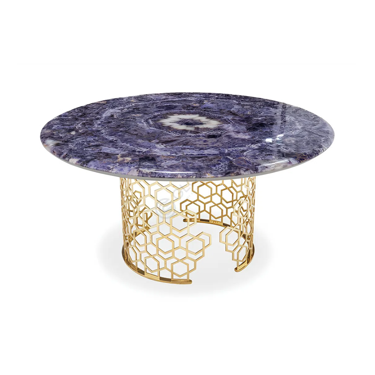 Основание представляет собой произведение искусства из нержавеющей стали. Его сложный геометрический узор, напоминающий пчелиные соты, придает предмету легкость и воздушность, одновременно обеспечивая прочность конструкции. Металлическая отделка добавляет эффектный блеск и подчеркивает статус консоли.