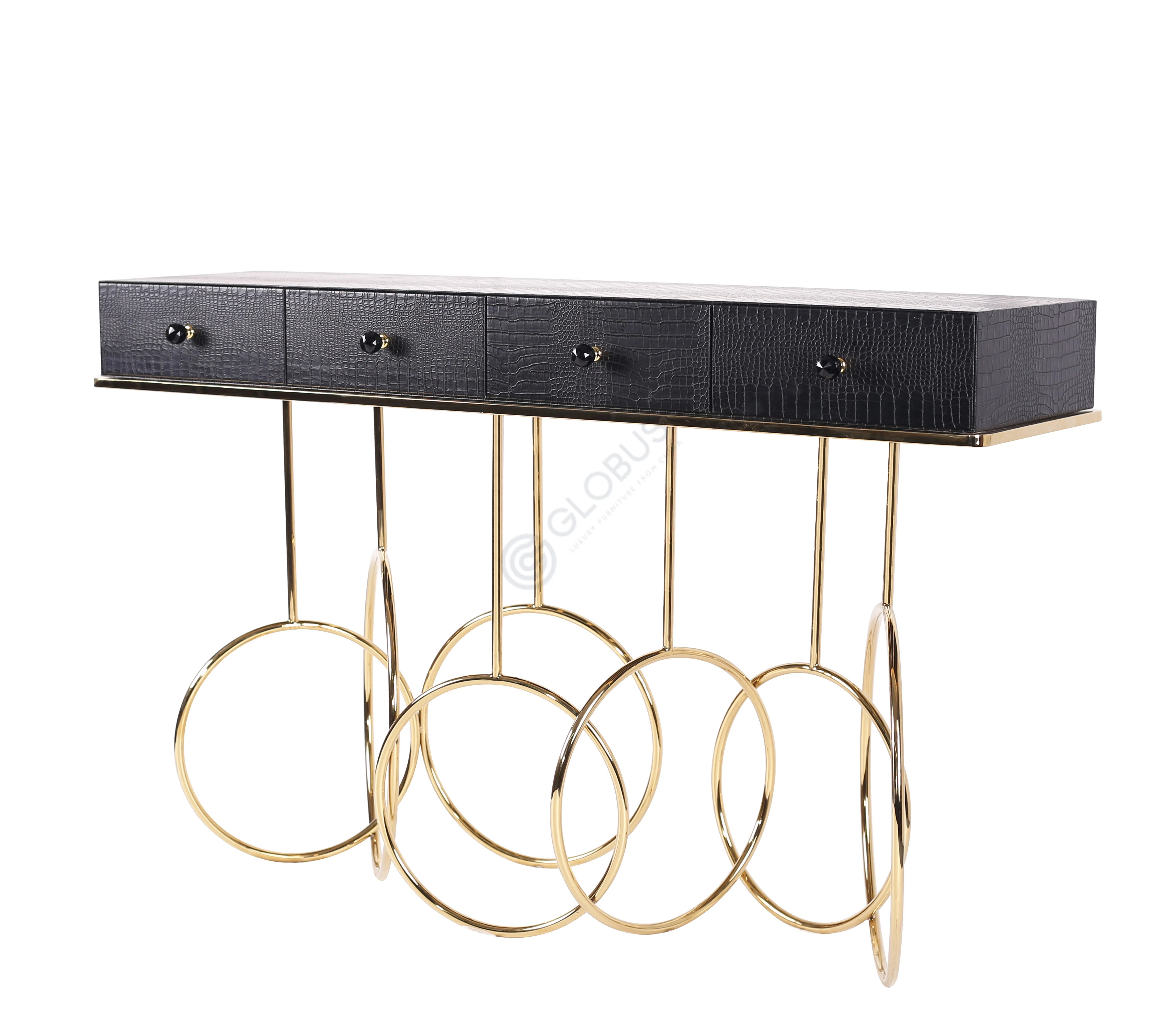 Основание представляет собой переплетение полированных металлических колец. Этот геометрический узор добавляет визуальной динамики и легкости конструкции, создавая ощущение воздушности при всей надежности исполнения.
