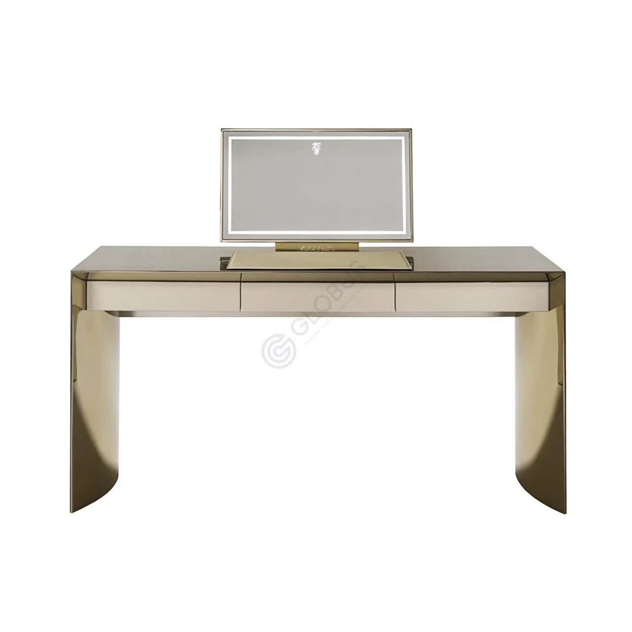 Каркас выполнен из натурального дерева и фанеры, что гарантирует прочность и долговечность. Металлическая основа из нержавеющей стали придаёт конструкции утончённый вид, а её золотистое покрытие добавляет элемент элегантности.