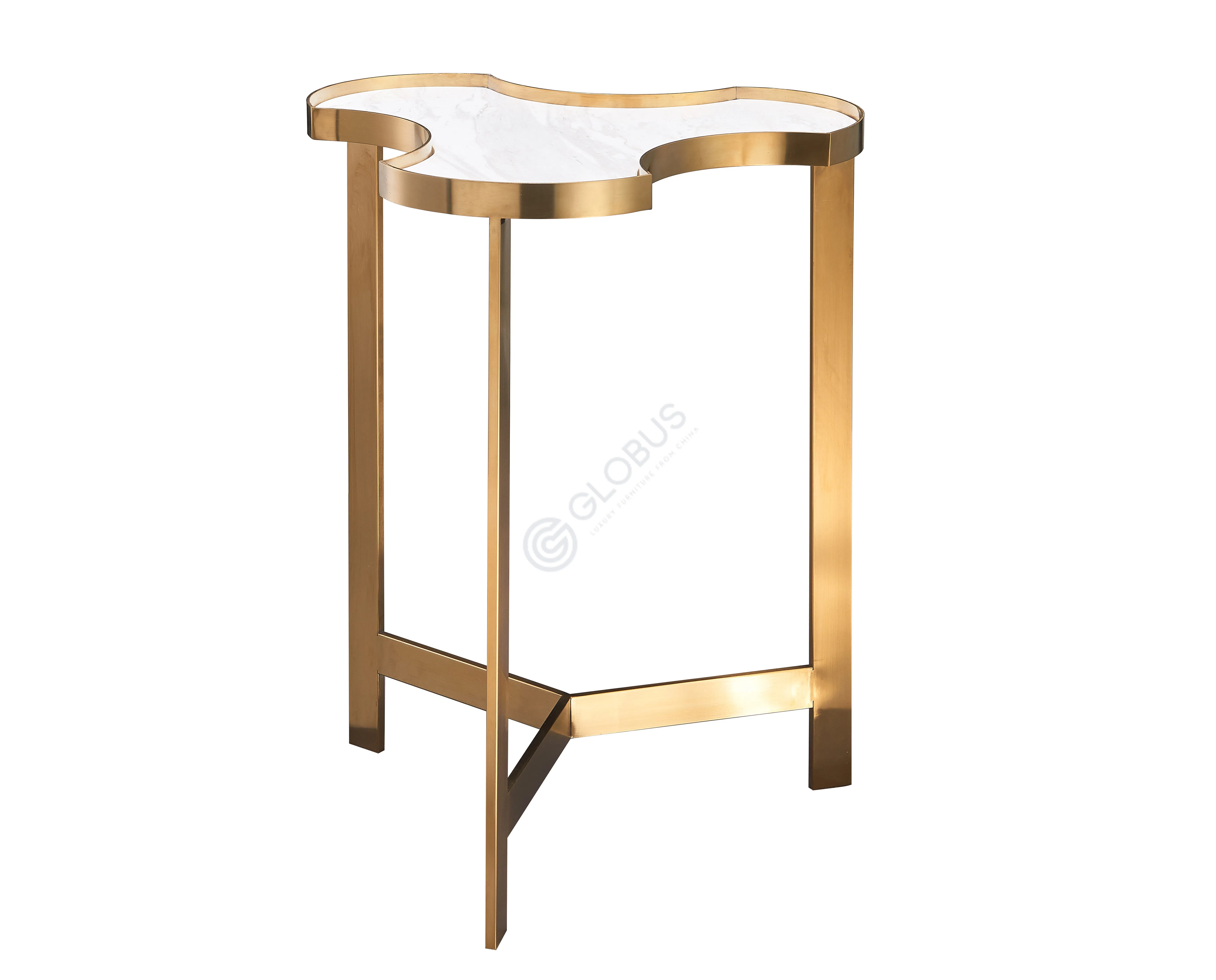 Особое внимание привлекает органическая форма мраморных столешниц. Их изящный контур напоминает нежный лепесток или лист клевера, добавляя плавность и природную красоту строгим линиям металлической опоры. Разные высоты и размеры столиков позволяют использовать их как вместе, образуя многоуровневую композицию, так и по отдельности, предлагая гибкие решения для организации пространства.