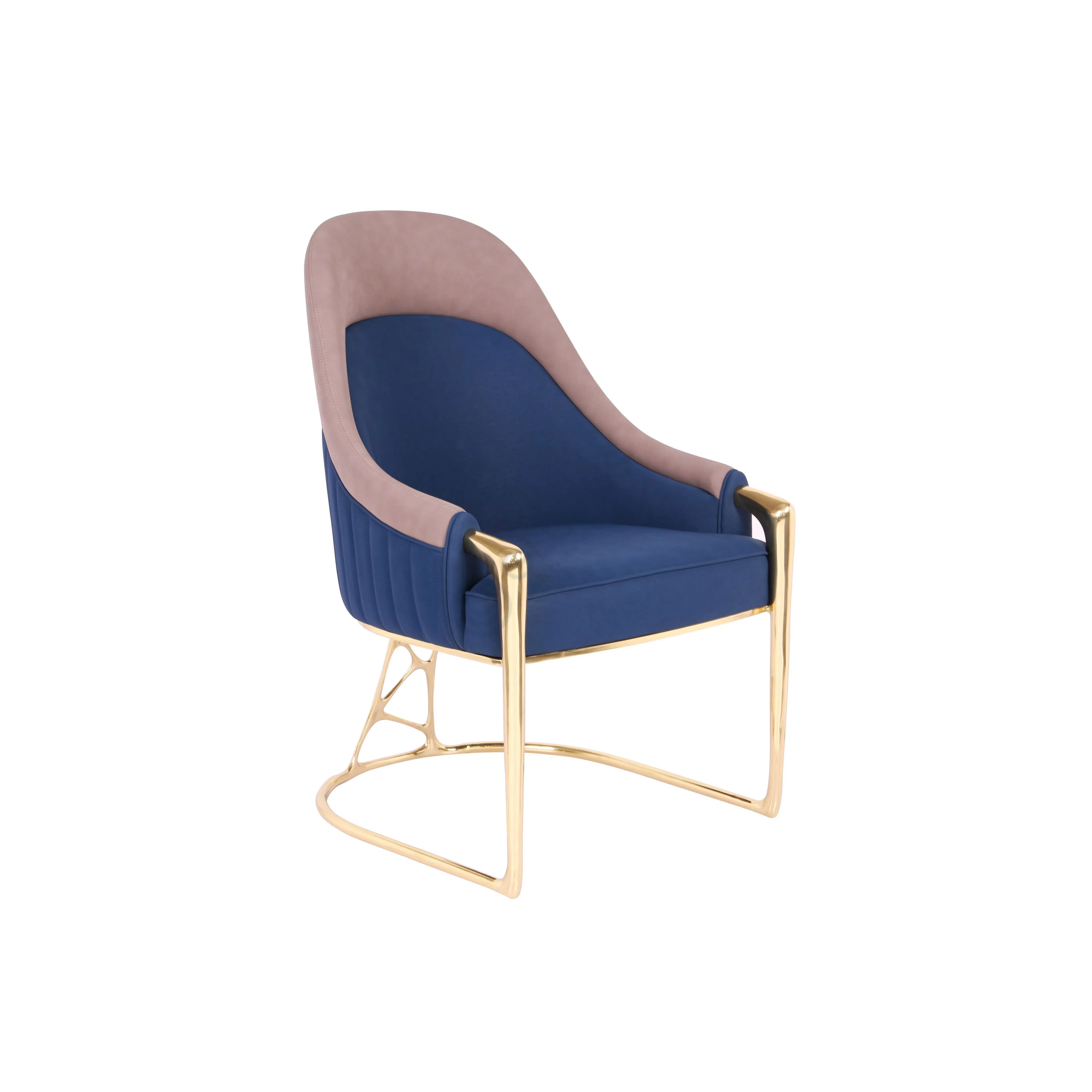 Особую выразительность стулу придает уникальное основание. Изящные ножки, изготовленные из сияющей латуни, формируют динамичный и устойчивый силуэт. Их золотистый отблеск добавляет нотку роскоши, характерную для эстетики ар-деко.
