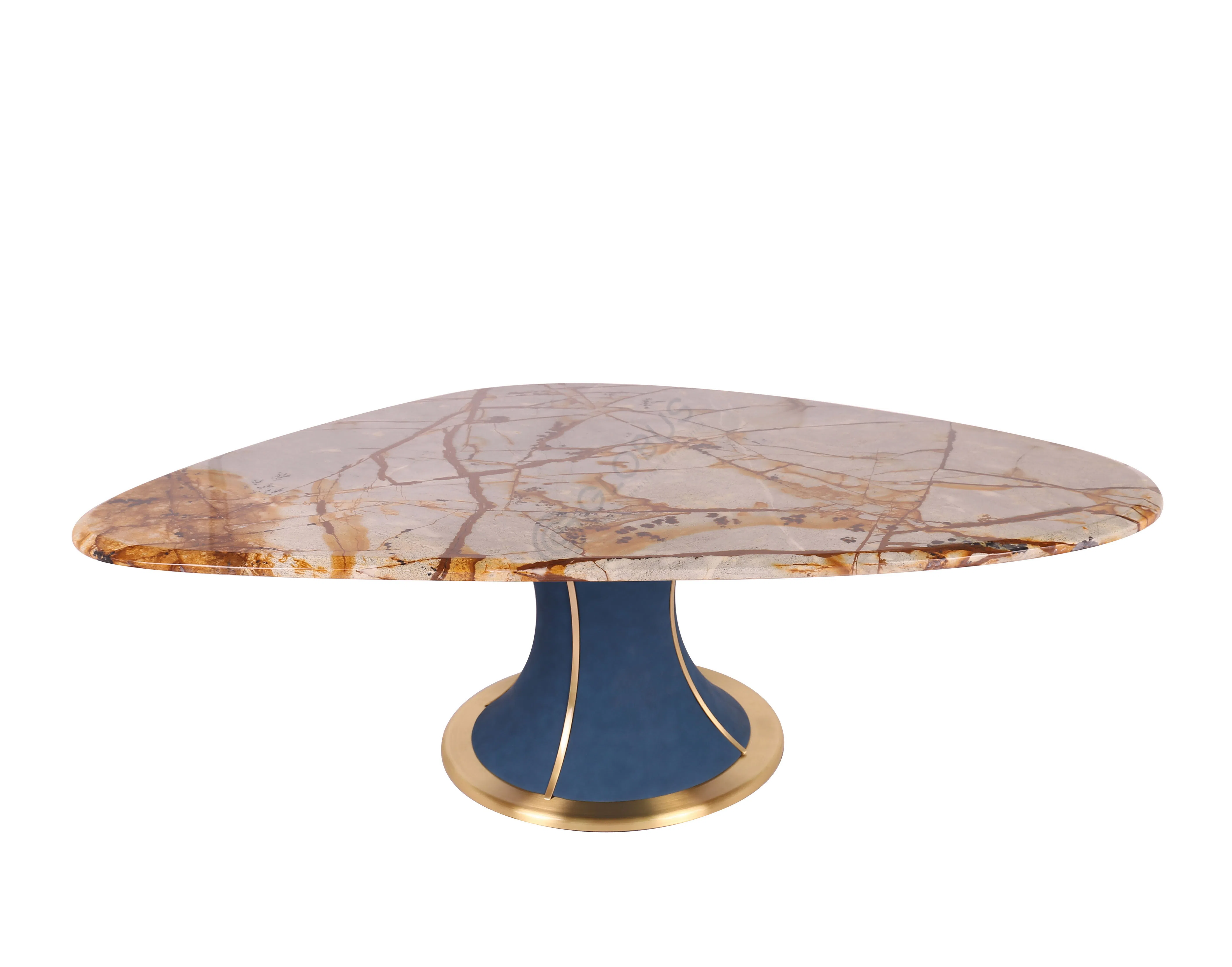 Сочетание благородных элементов создает его уникальный облик. Столешница выполнена из природного камня с неповторимым узором, а основание, изготовленное из натурального дерева, обтянуто мягкой экокожей глубокого оттенка. Финальные акценты расставлены деталями из сияющей латуни.