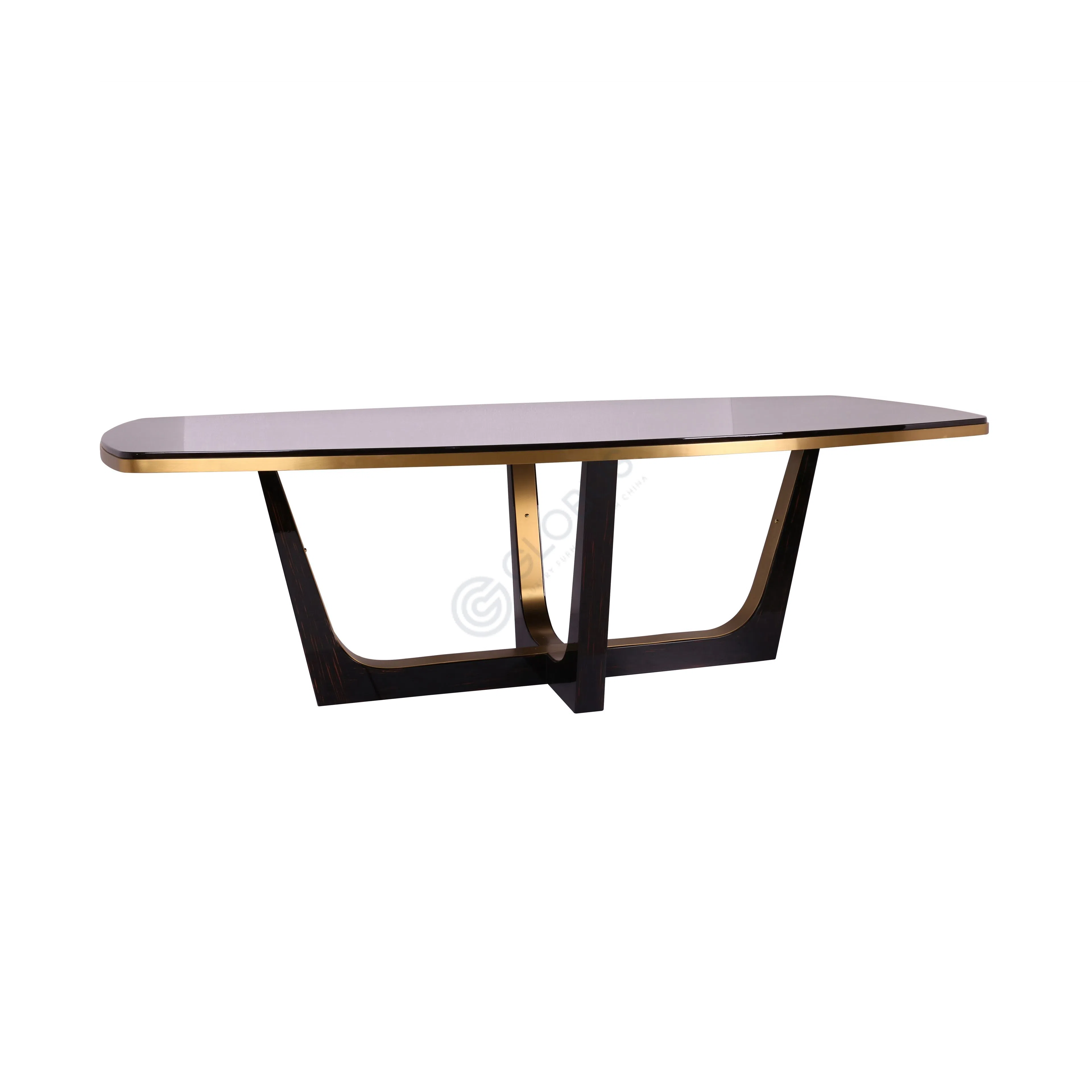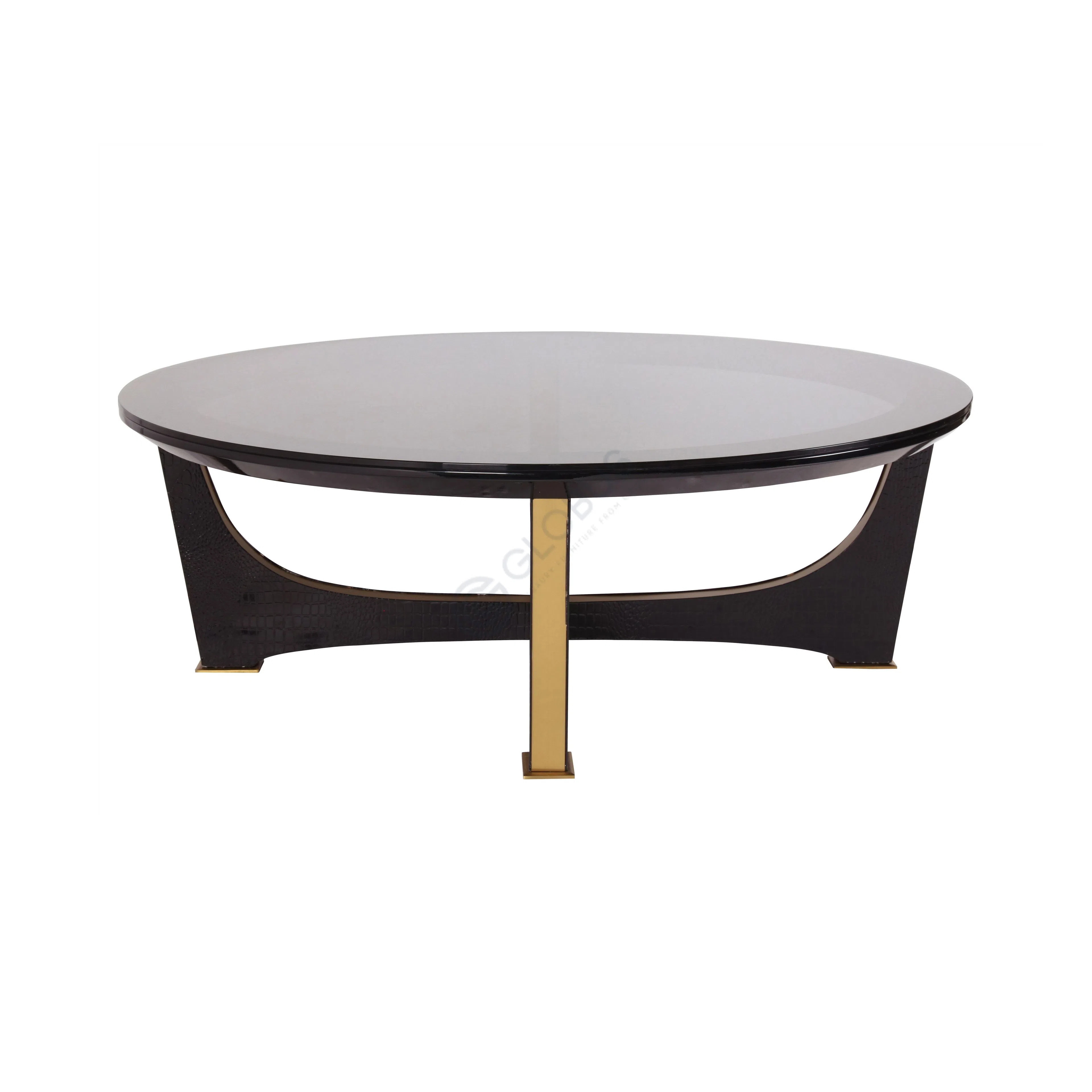 Столешница выполнена из прочного закаленного стекла, предлагая гладкую, блестящую поверхность. Ее поддерживает основание, составленное из сияющего элемента нержавеющей стали золотистого оттенка и двух массивных опор из МДФ, декорированных под кожу рептилии, что придает предмету особую выразительность и характер.