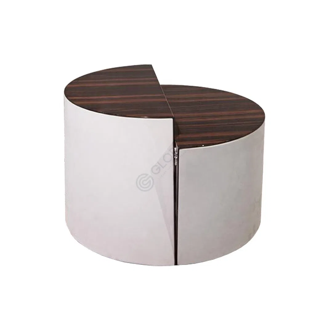 В отделке предмета мебели искусно переплетаются фактуры. Гладкая, отражающая поверхность полированной нержавеющей стали контрастирует с теплотой и естественным рисунком шпона, который придает глубину и утонченность общему облику. Основа конструкции выполнена из прочного МДФ, обеспечивая надежность и долговечность.
