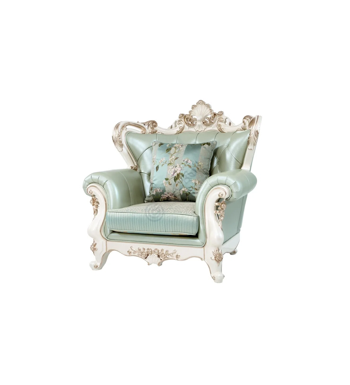 Для максимального комфорта изделие комплектуется декоративными подушками. Они сочетают ткани с цветочным орнаментом и однотонный текстиль с богатой фактурой, гармонично дополняя общий облик и приглашая к отдыху. Этот предмет мебели несет в себе дух минувших эпох, предлагая комфорт и стиль для современного утонченного интерьера.