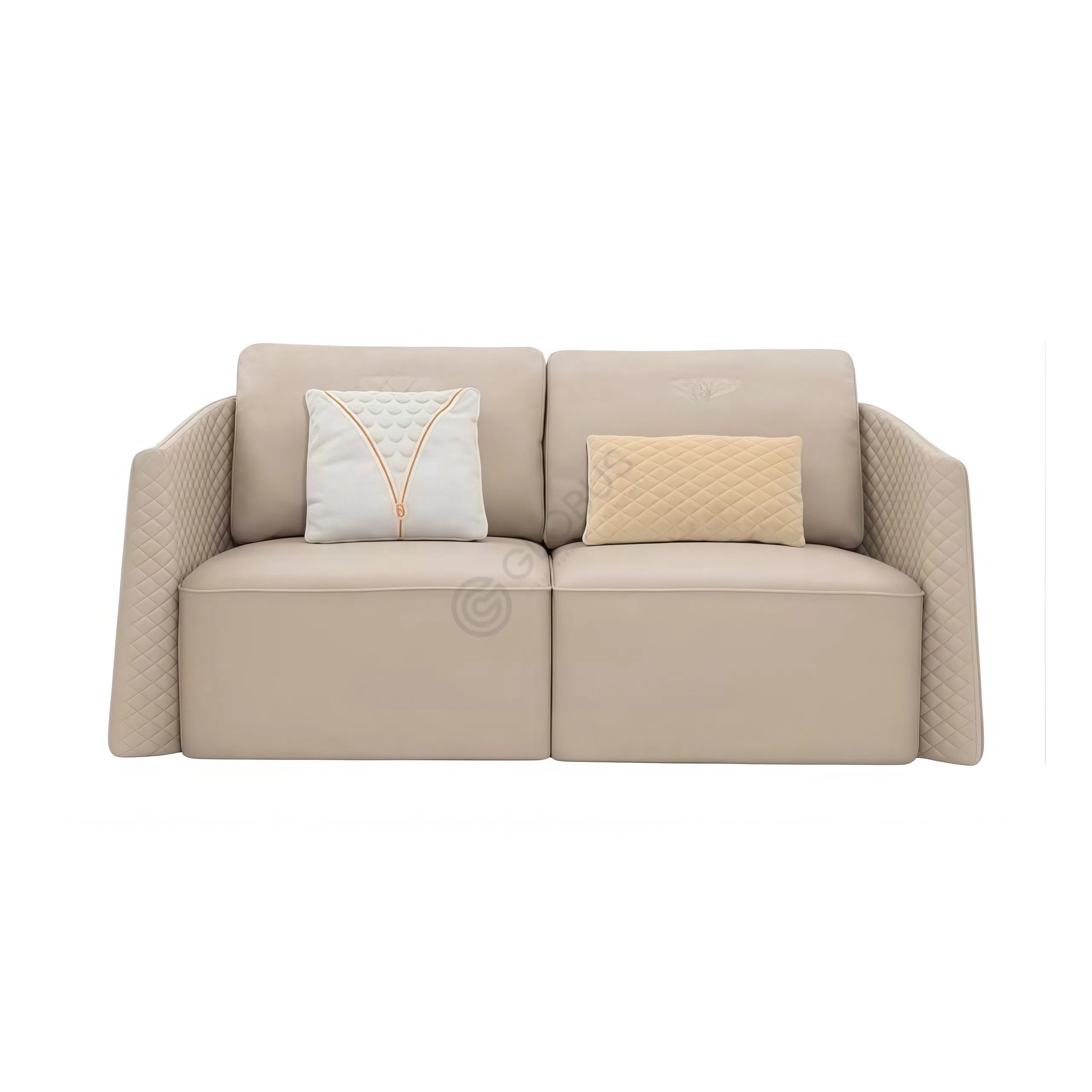 Каркас изделия выполнен из натурального дерева, что обеспечивает его долговечность и стабильность. Внешняя обивка из высококачественного текстиля приятна на ощупь и подчеркивает плавность линий. Особое внимание уделено деталям: на одной из сторон заметна оригинальная фактура, добавляющая предмету уникальности.